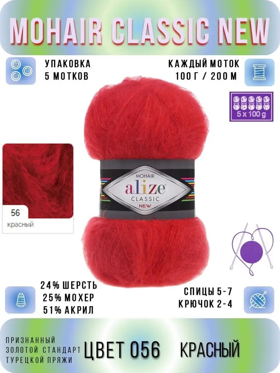 Пряжа ALIZE "Mohair classic new", 100 гр 200 м, 25% мохер, 24% шерсть, 51% акрил, 56 красный, 5 шт