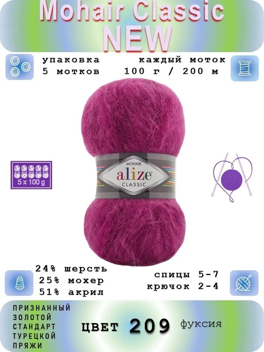 Пряжа Alize Mohair Classic фуксия (209), 24%шерсть/25%мохер/51%акрил, 200м, 100г, 1шт