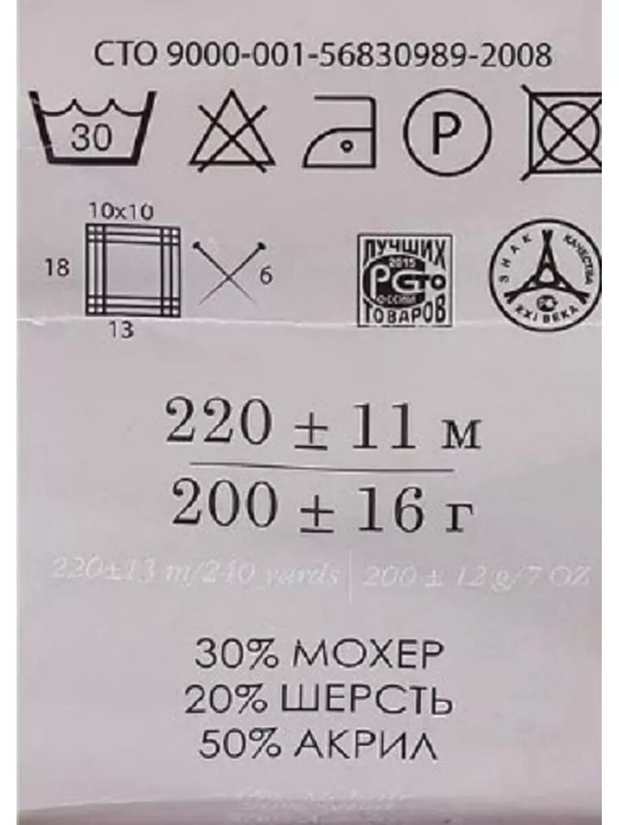 | Состав | 20% шерсть / 84% ПАН / 30% мохер / 50% акрил / 50% высокообъемный акрил |