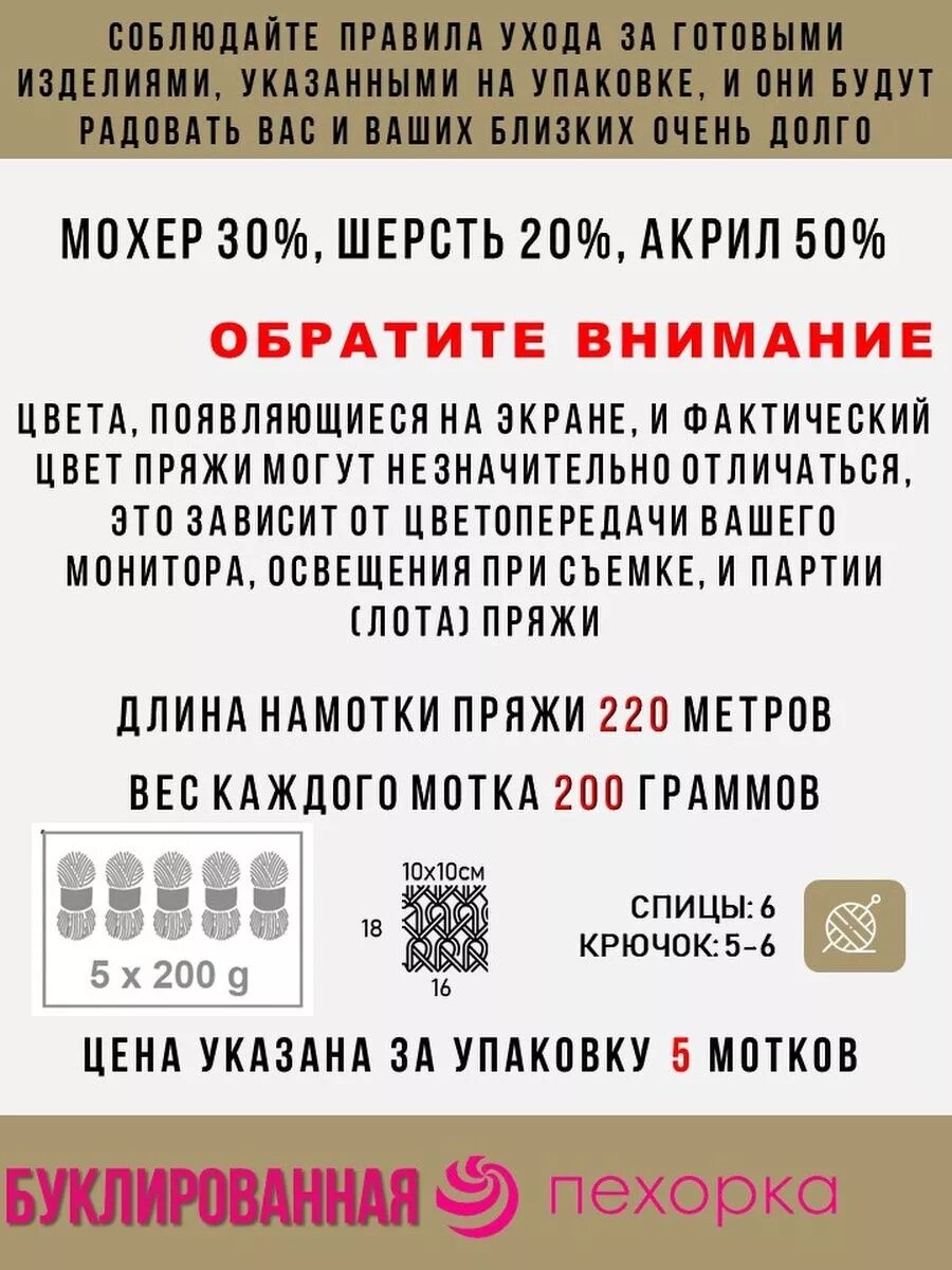 Пряжа Пехорка Буклированная грильяж (173), 30%мохер/20%шерсть/50%акрил, 220м, 200г, 5шт