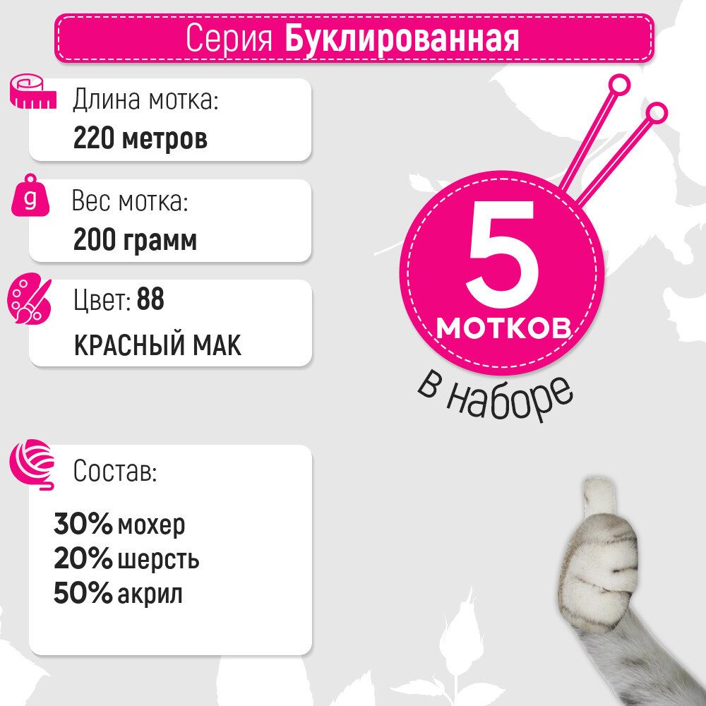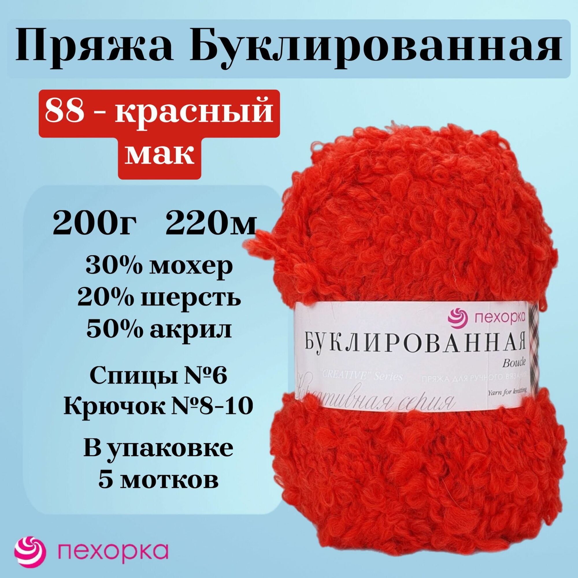 Пряжа Пехорка 'Буклированная' 200гр. 220м. (30% мохер, 20% шерсть, 50% акрил высокообъемный) (88 красный мак). В комплекте 5 штук.