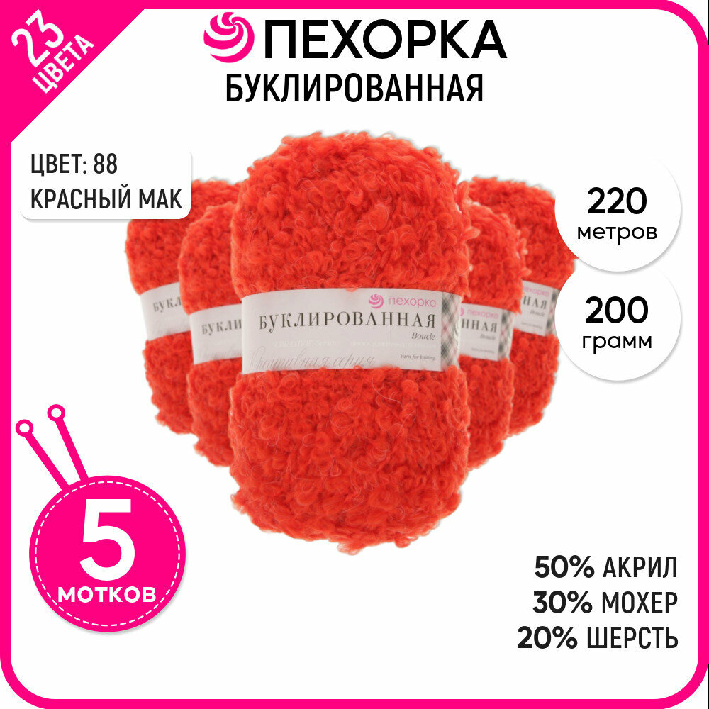 Пряжа Пехорка Буклированная цвет 88 красный мак (200г/220м, упаковка 5 мотков)