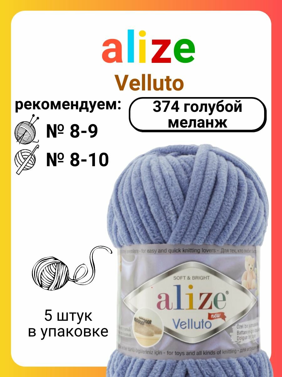 Пряжа VELLUTO (Alize), джинс - 374, 100% микрополиэстер, 5 мотков, 100 г, 68 м.