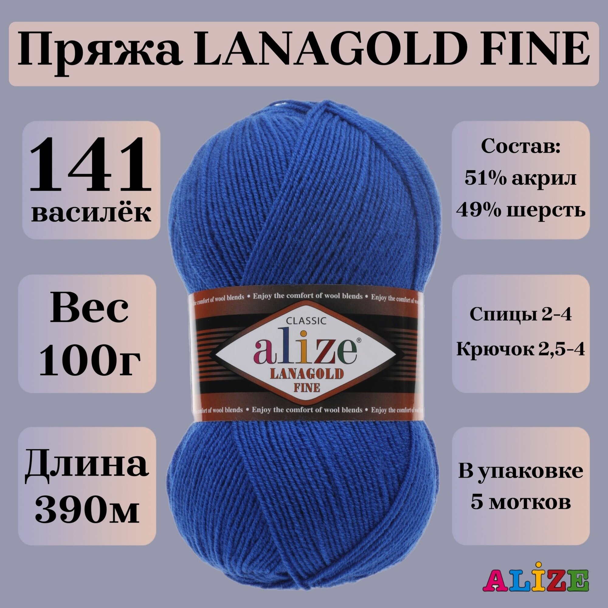 Пряжа для вязания ALIZE LANAGOLD FINE: 141 (василек), 5 шт 390 м 100 г, 49% шерсть 51% акрил