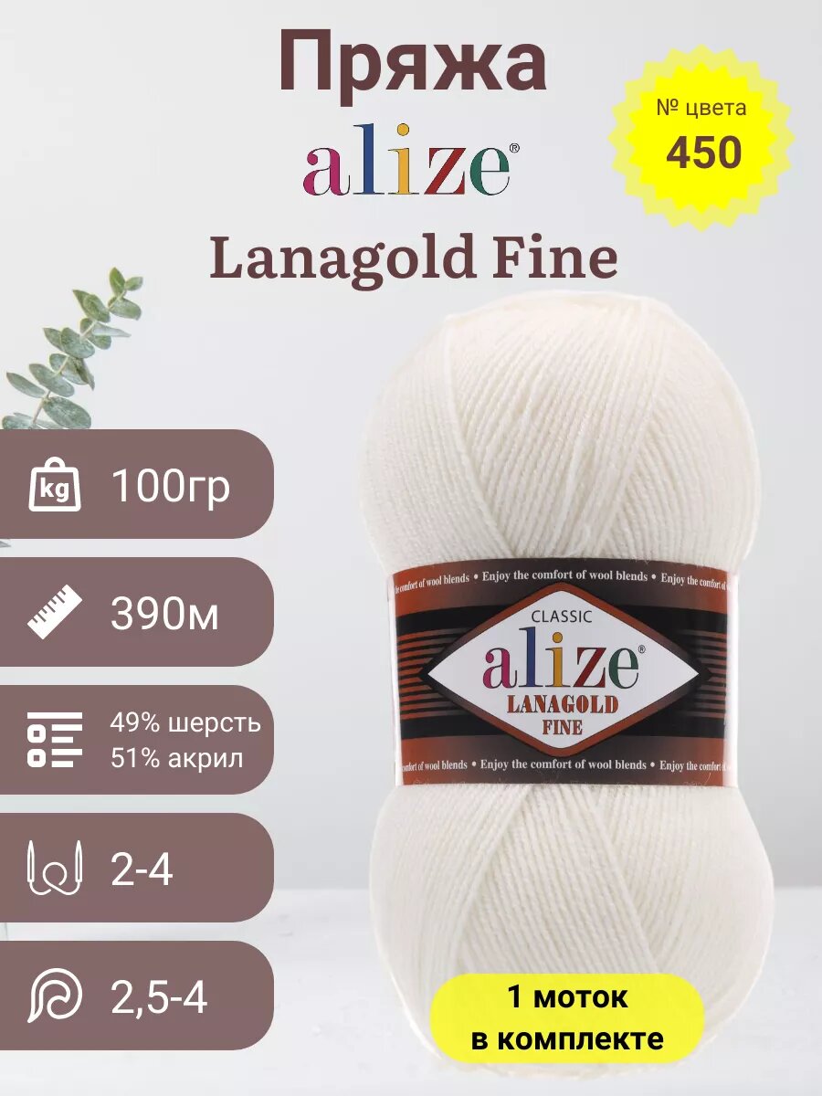 Пряжа Alize Lanagold Fine (Ланаголд Файн) - 2 шт Цвет: 62 молочный 49% шерсть, 51% акрил 100г 390м