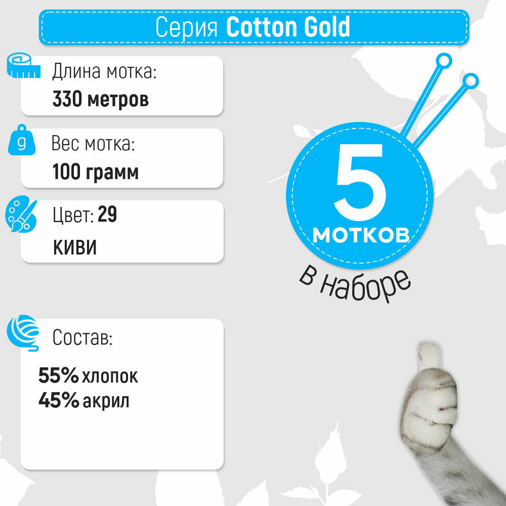Пряжа Хлопок голд (Cotton gold) упаковка 5 мотков 100 г, 330 м. 55% хлопок 45% акрил цвет 514 ледяной