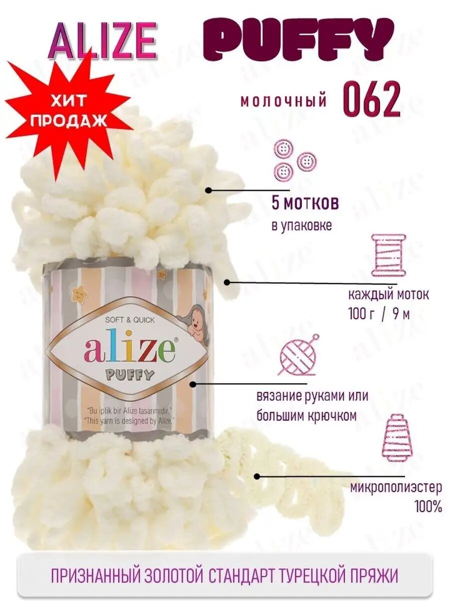 СохранитьПряжа плюшевая Alize Puffy (Ализе Пуффи) - 5 мотков 62 светло-молочный для вязания руками, гипоаллергенная, большие петли (4см), 9м/100г интересное: