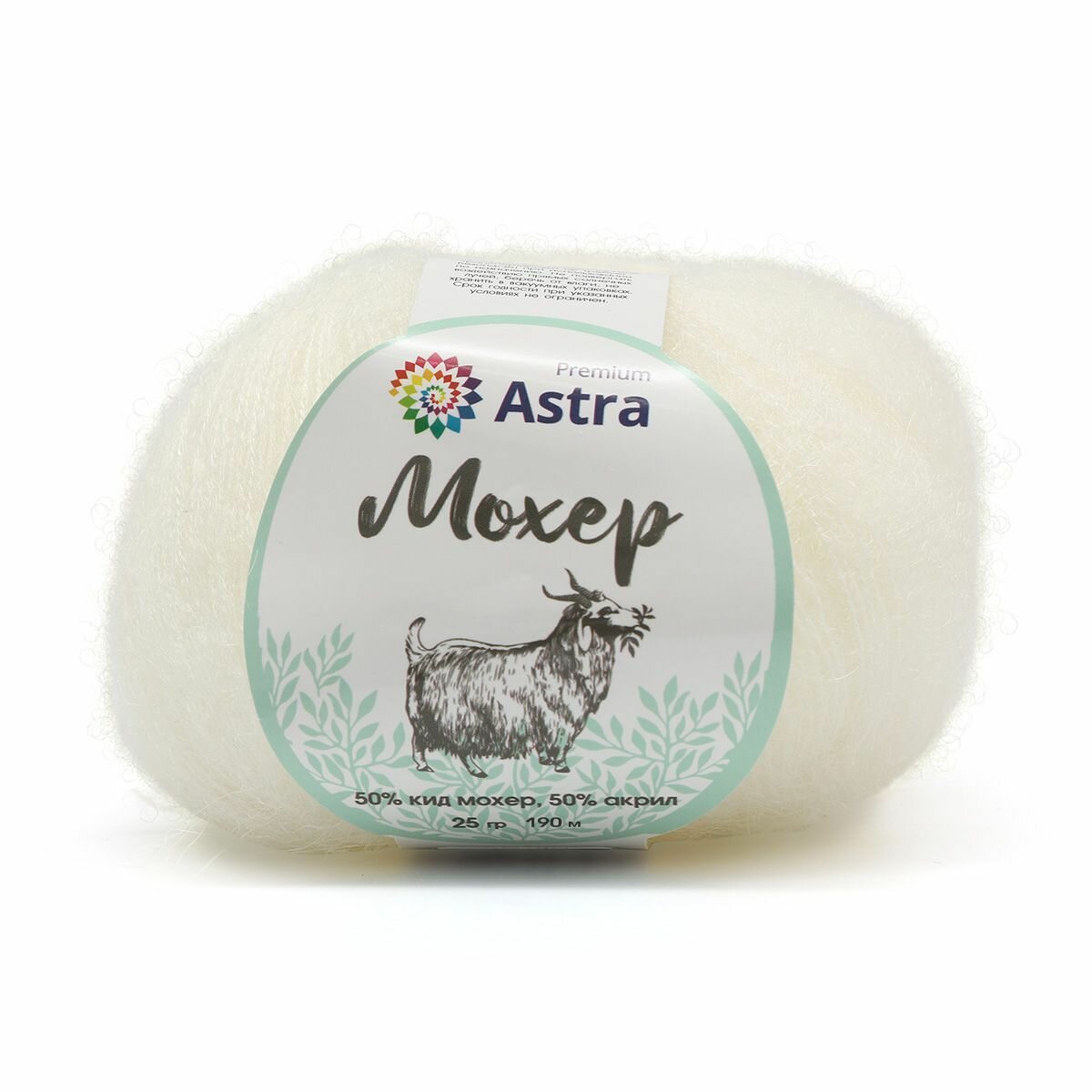 Пряжа Astra Premium "Mohair", 25 г, 190 м, 50% кид мохер, 50% акрил, цвет 01 белый, 4 мотка