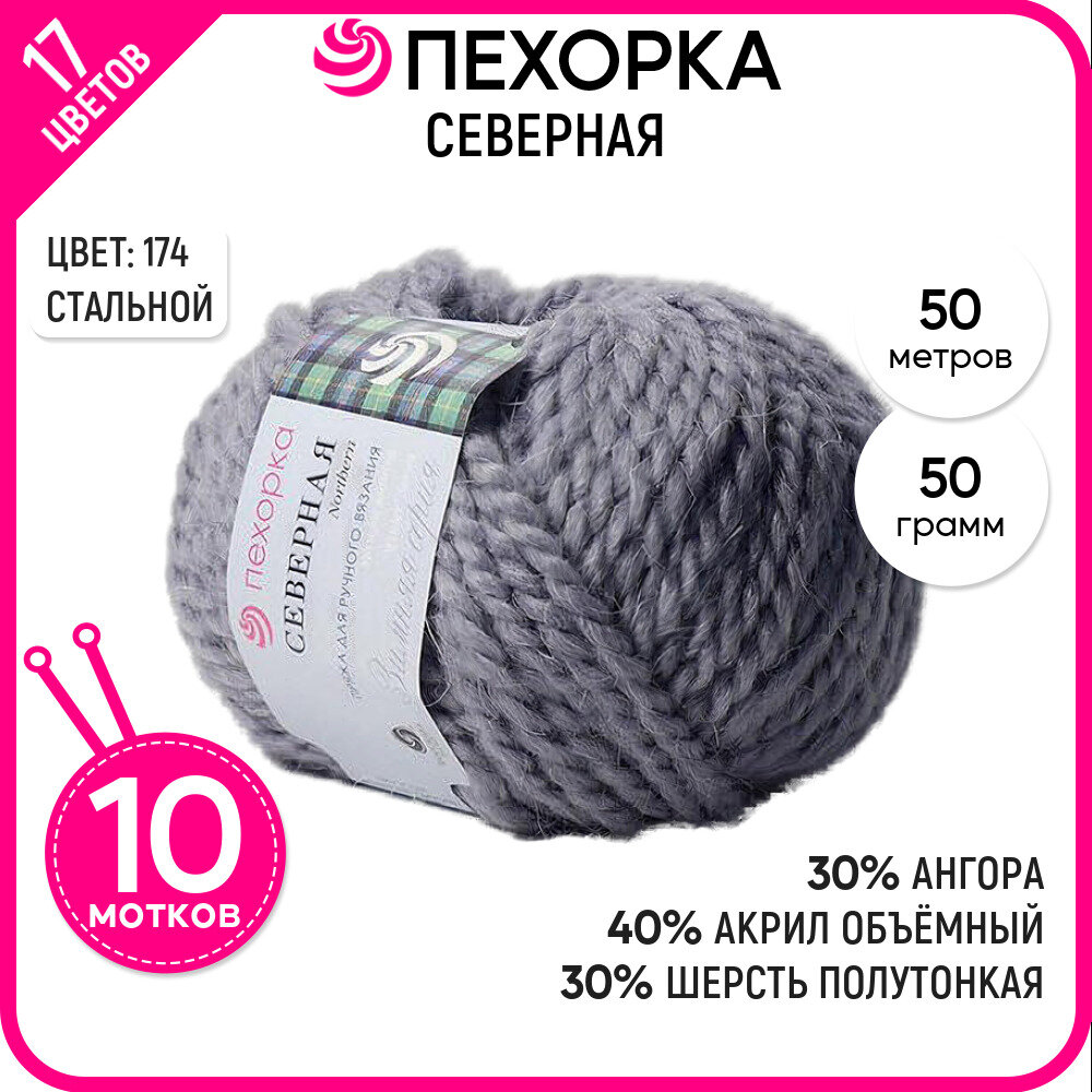 Пряжа Северная (Пехорка), Стальной - 174, 30% ангора, 30% шерсть П/Т, 40% акрил высокообъемный, 10 мотков, 50 г, 50 м.