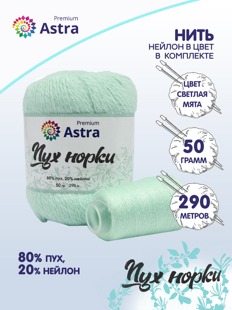Пряжа Astra Premium "Пух норки", 50 гр 290 м, 80% пух, 20% нейлон, нить 20 гр, 041 светлая мята