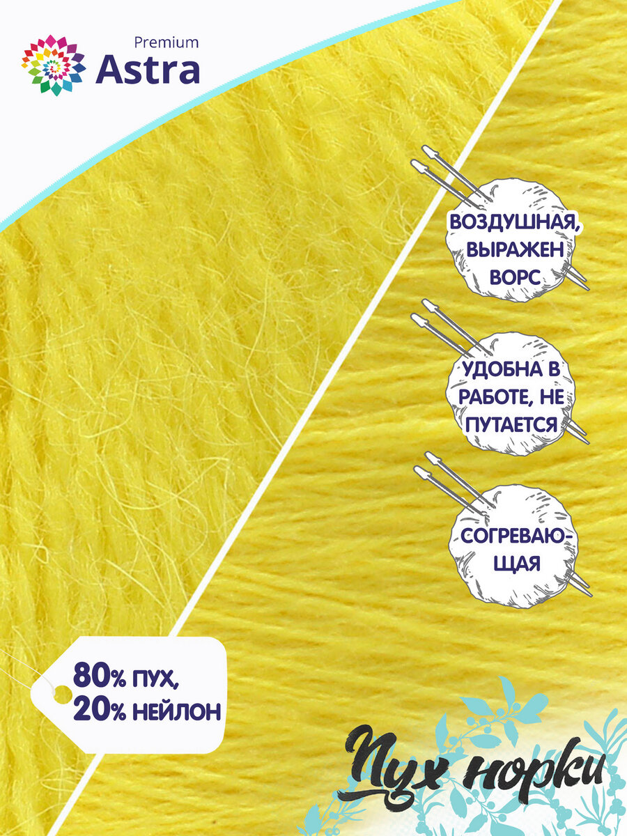 Пряжа Astra Premium "Пух норки", 50 гр 290 м, 80% пух, 20% нейлон, нить 20 гр, 027 лимонный