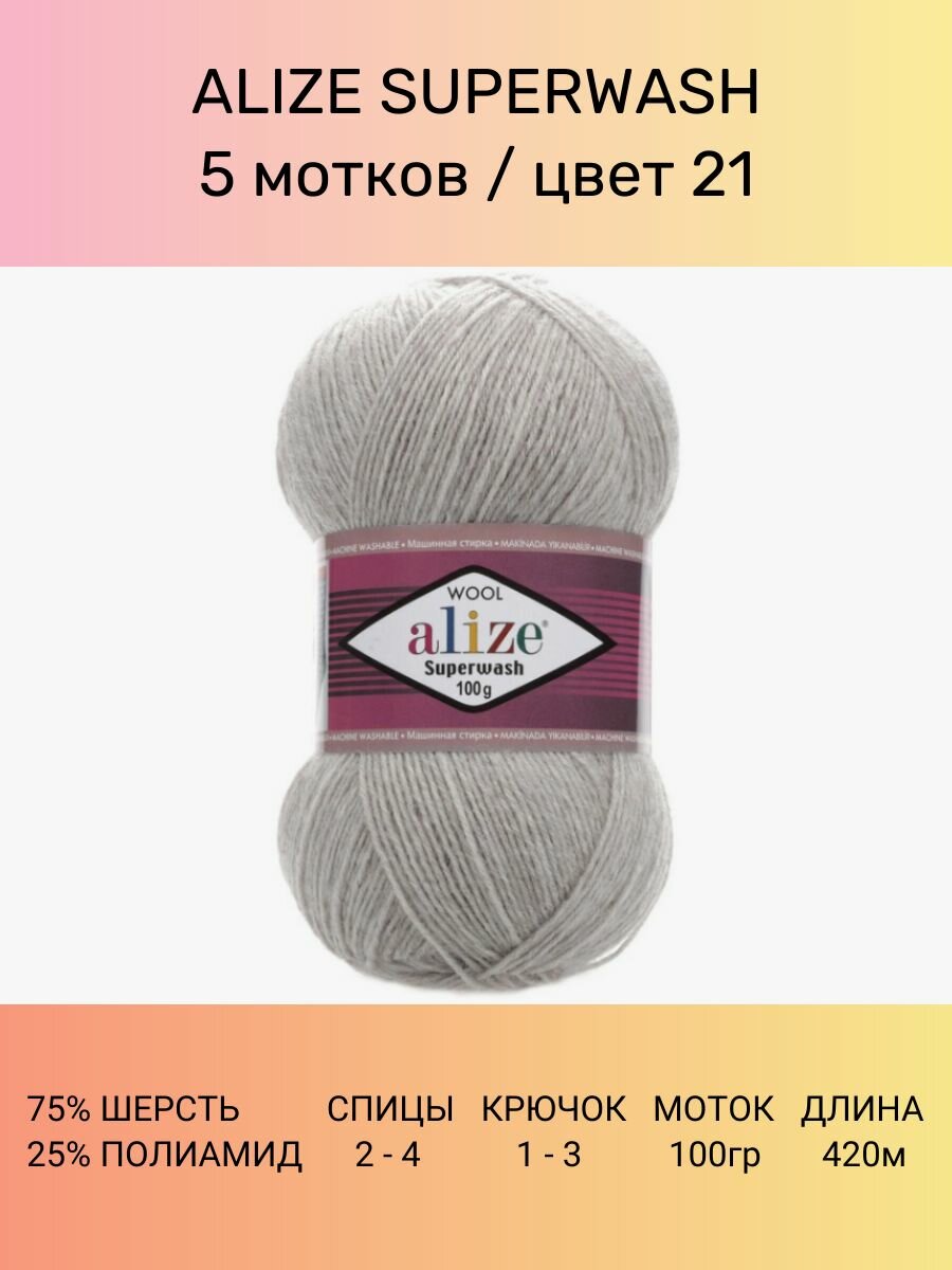 Пряжа ALIZE SUPERWASH 100, серый меланж - 21, 75% SW шерсть, 25% полиамид, 5 мотков, 100 г, 420 м.