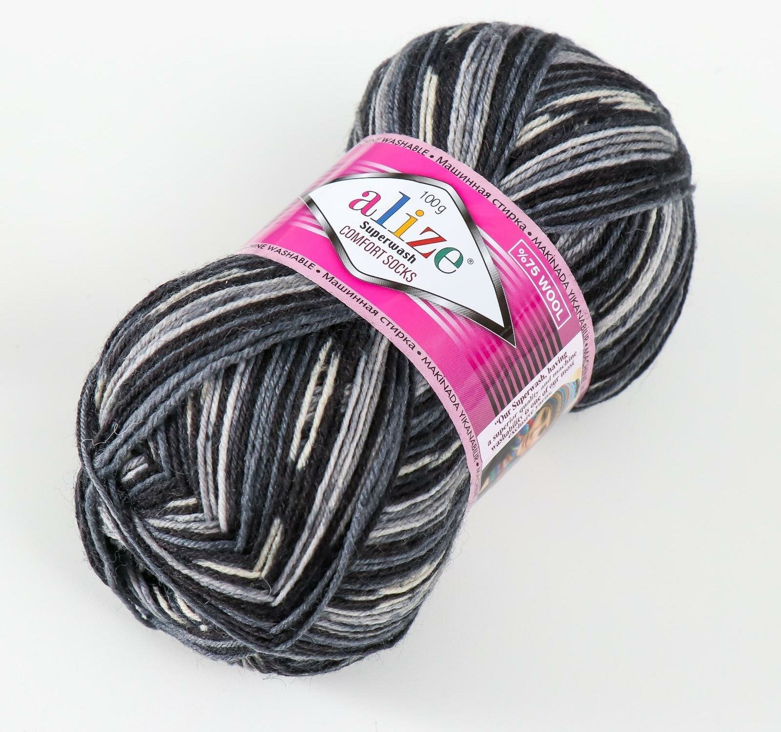 СохранитьПряжа Alize Superwash Comfort Socks (Ализе Супервош) - 1 моток, серый темно-серый черный (2695), 75% шерсть супервош, 25% полиамид, 420м/100г интересное: