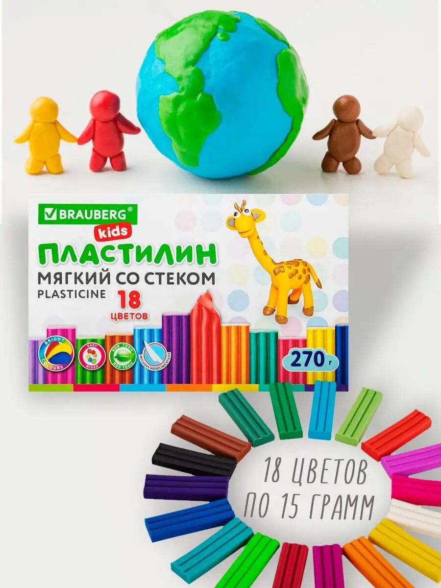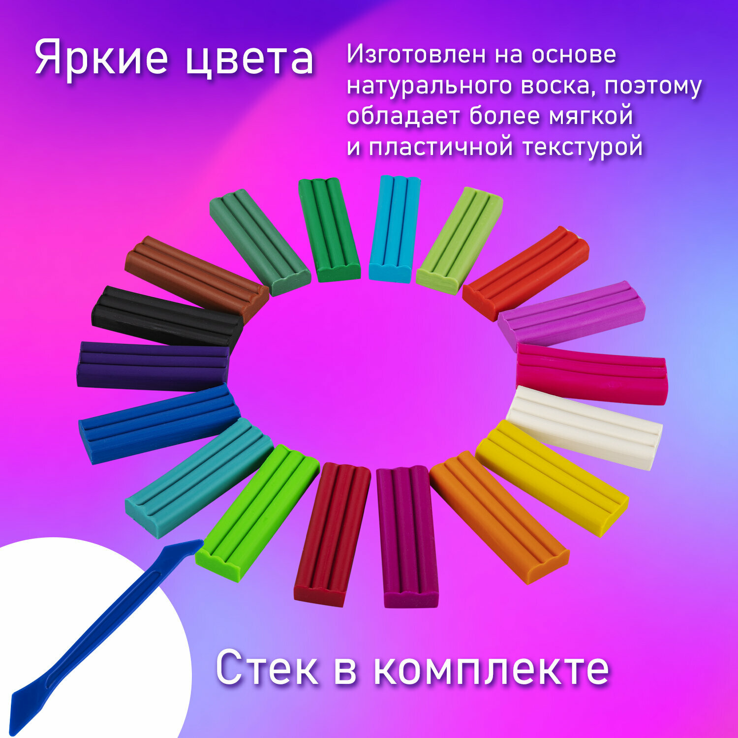 Купить Пластилин восковой для детей детский мягкий легкий воздушный Brauberg Kids, 18 цветов, 270 г, со стеком