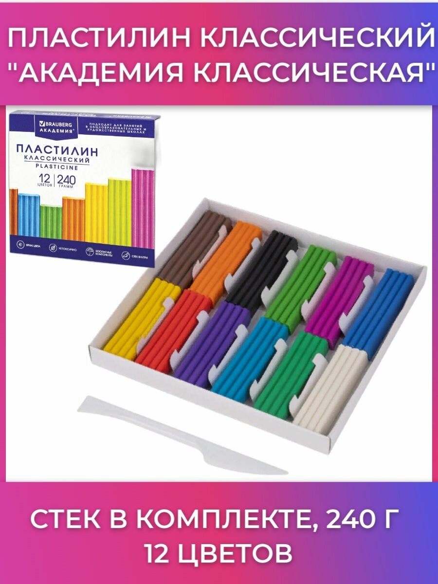 Пластилин классический BRAUBERG «академия классическая», 12 цветов, 240 г, стек, высшее качество, 106423
