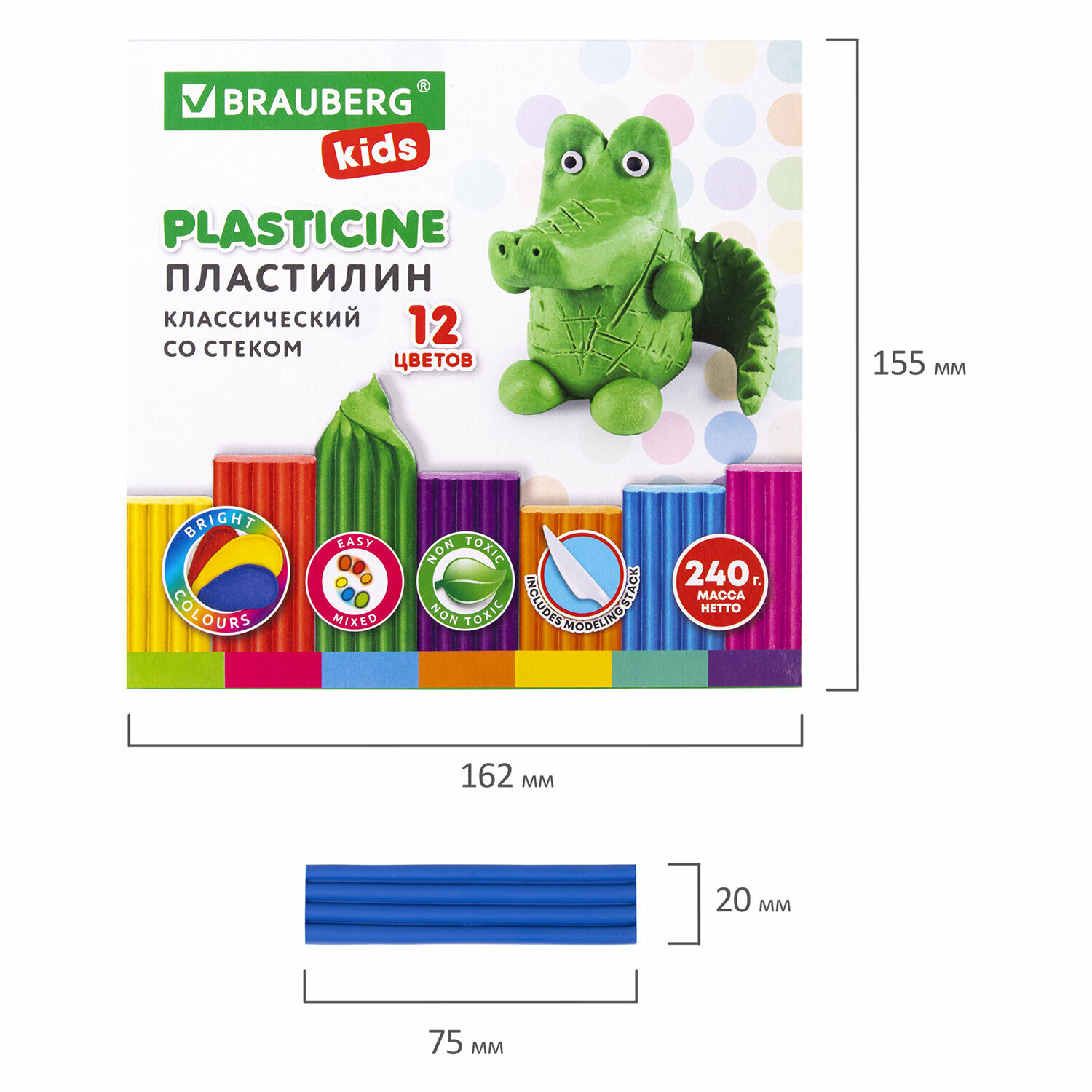 | Комплектация | в составе набора 12 брусков по 20 г разных цветов: белый / черный / коричневый / желтый / оранжевый / красный / розовый / фиолетовый / сиреневый / голубой / синий / зеленый. Масса набора – 240 г. Со стеком. |