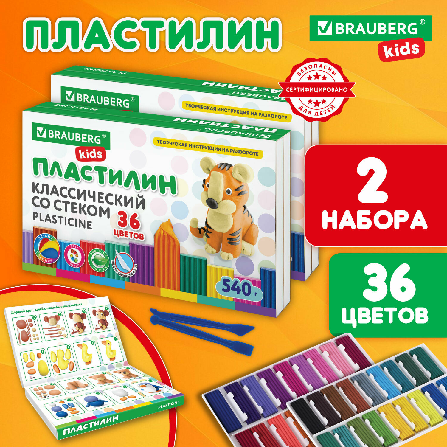 Комплект 2 шт, Пластилин классический BRAUBERG KIDS, 36 цветов, 720 г, стек, высшее качество, 106438
