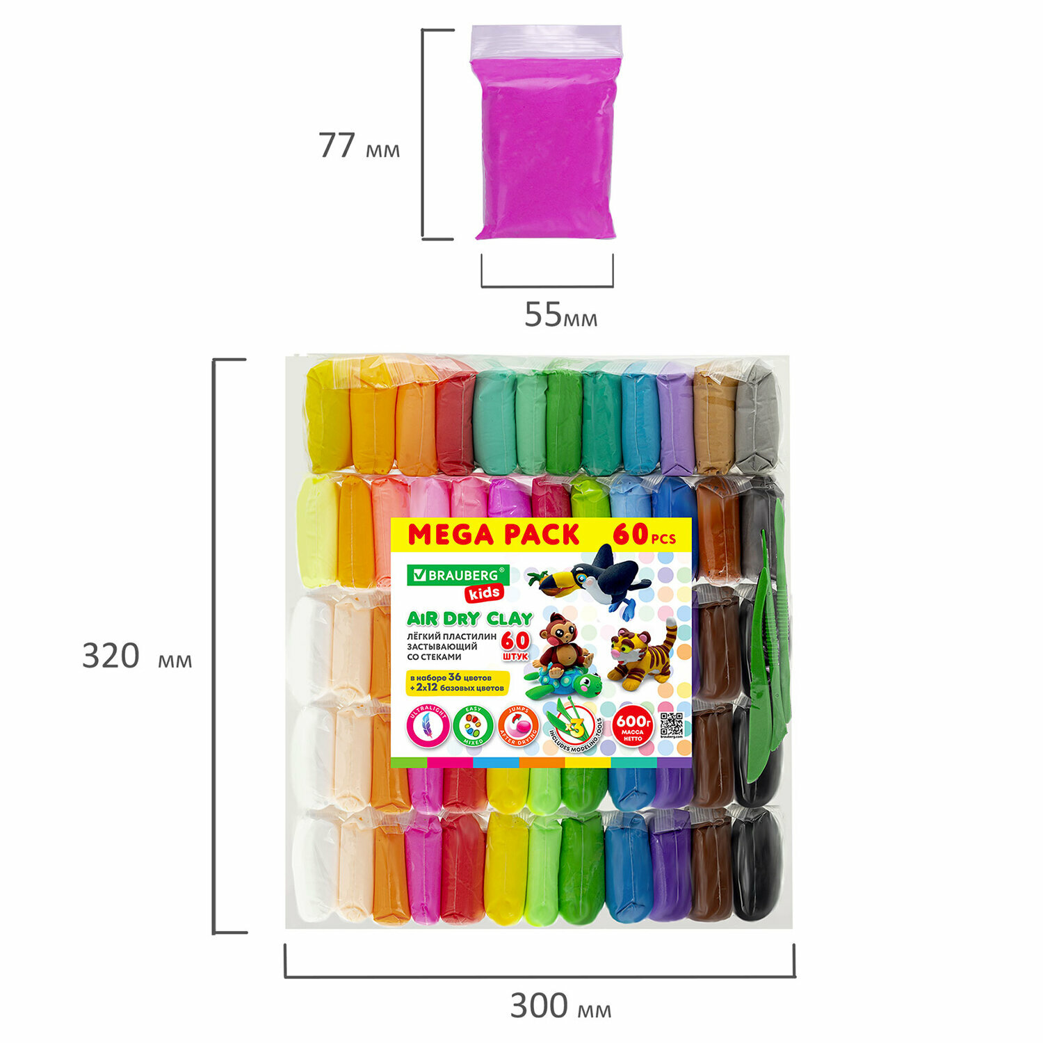 Пластилин супер лёгкий застывающий 600г 60 шт(36 цв+2х12 базовых!), 3 стека, BRAUBERG KIDS, 106311