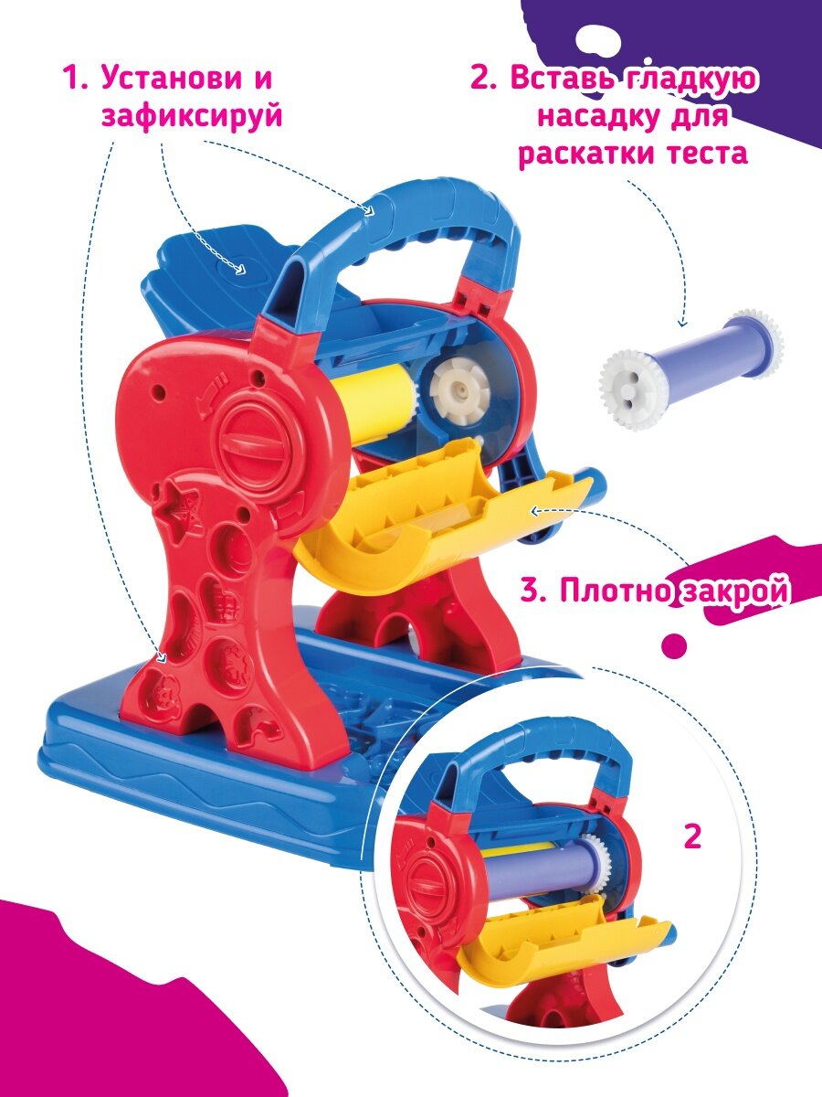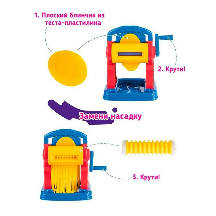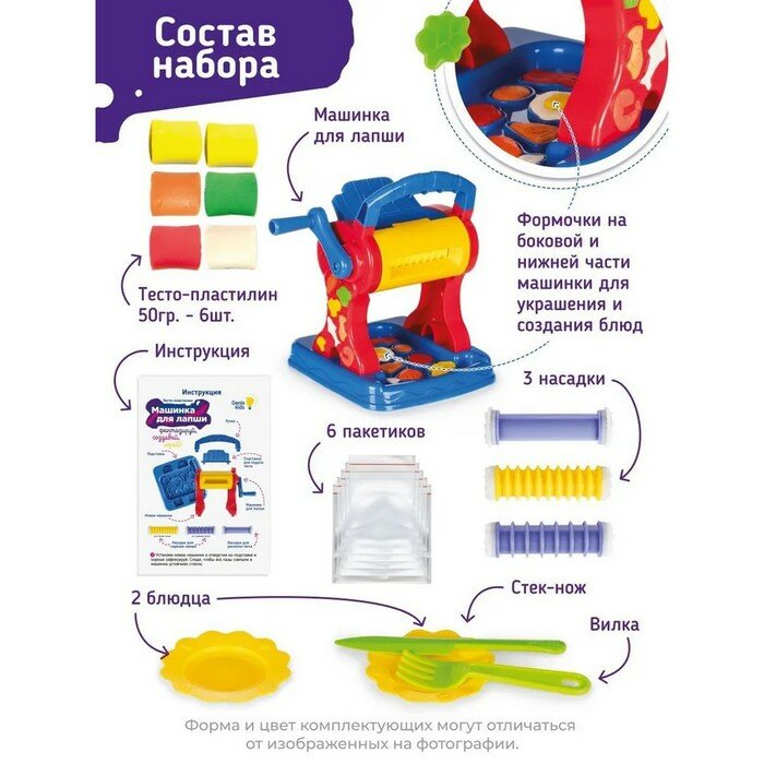 | Комплектация | тесто-пластилин 6 шт. по 50 г / пакетики для хранения 6 шт. / насадка для раскатки теста / 2 насадки для нарезки теста / вилка / 2 блюдца / нож / машинка для лапши / инструкция. |