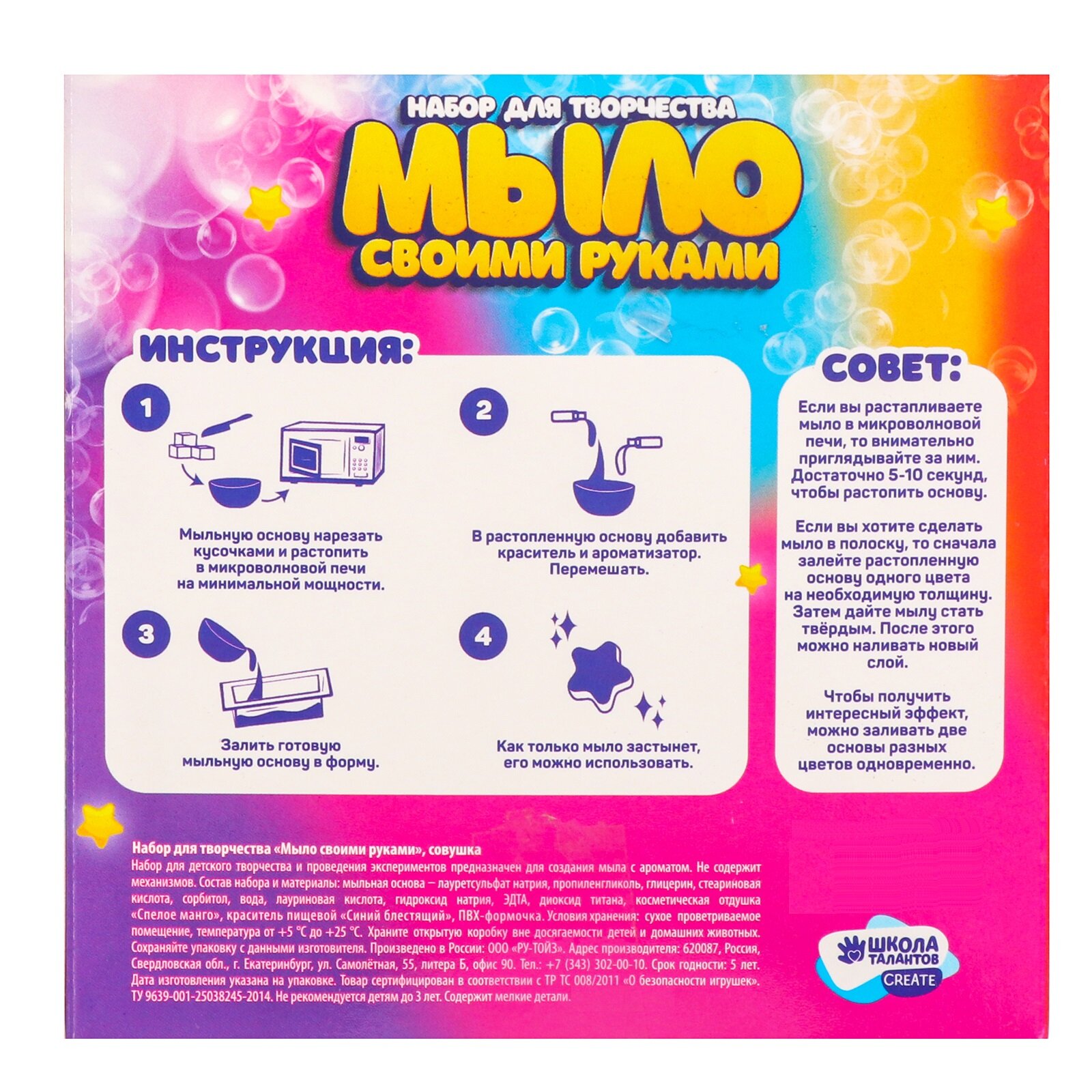 | В комплекте | ароматизатор, краситель, мыльная основа, формочка |
