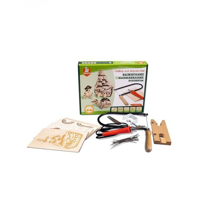 | Подробная комплектация | аппарат для выжигания по дереву (пирограф, 220v, 30w) - 1 шт. (длина прибора 23 см, длина шнура 90 см), подставка под аппарат - 1 шт. (5х8 см), насадки для аппарата для выжигания - 6 шт. (1,6 см), доска с нанесённым рисунком (пират, корабль, кит) - 3 шт. (15х21 см, толщина 3 мм), доска без рисунка (пробная) - 1 шт. (21х11 см, толщина 3 мм), лобзик со струбцинами и ключом – 1 шт., распилочный столик – 1 шт., руководство по эксплуатации – 1 шт. |