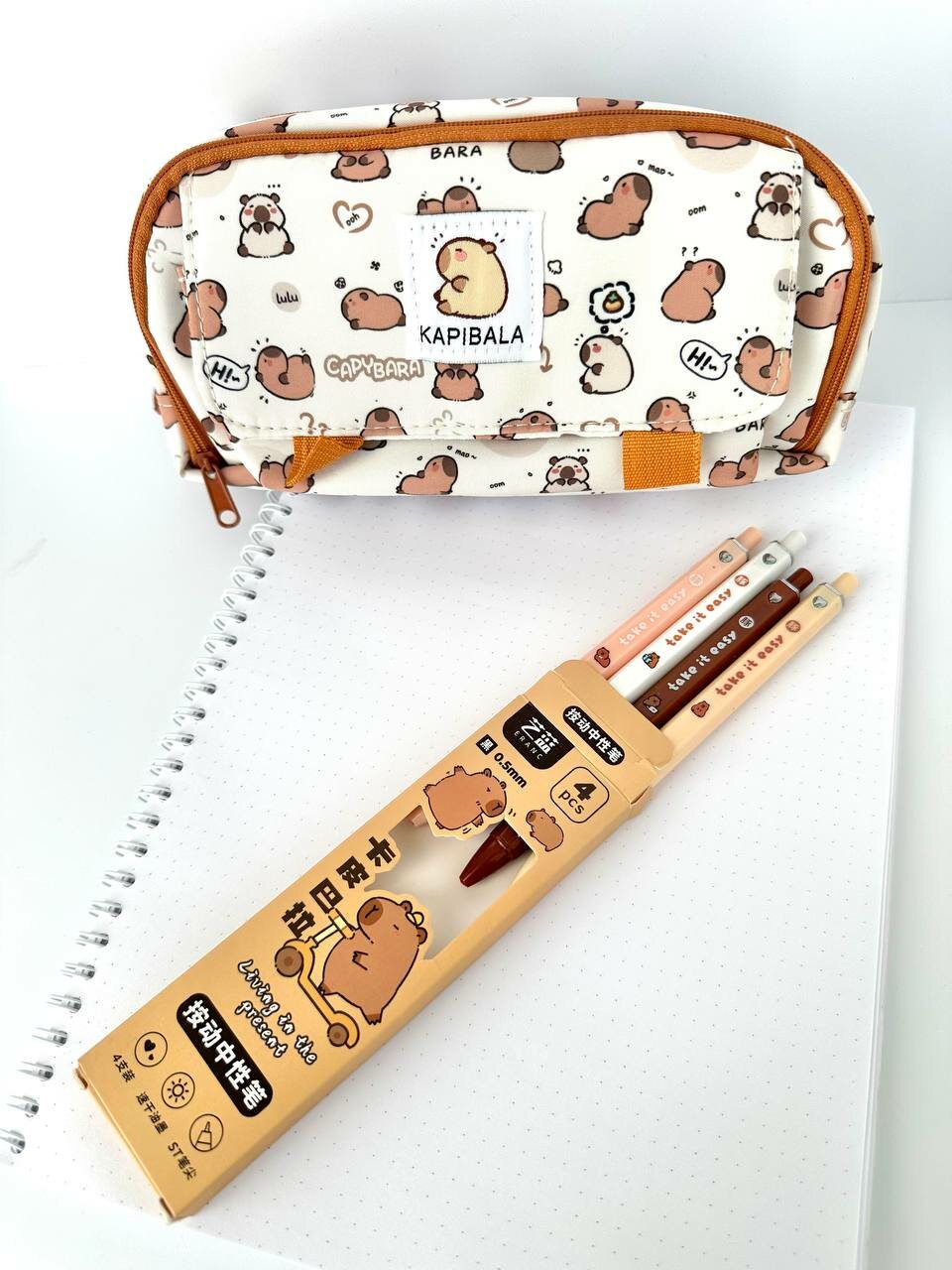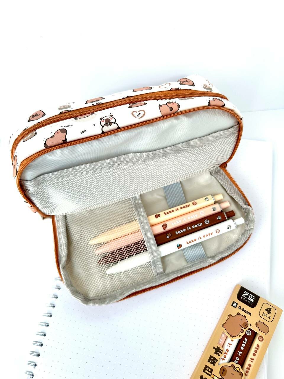 Купить Школьный детский пенал для подростков с капибарой - Эстетичный канцелярский органайзер, белый, ручки в подарок