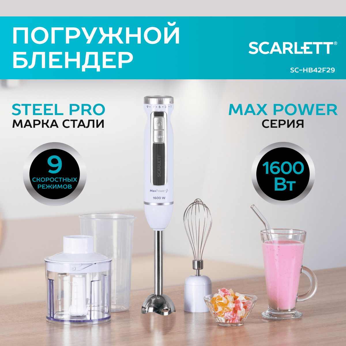 Погружной блендер Scarlett SC-HB42F29 , 9 режимов и турбо режим, нержавеющая сталь интересное: