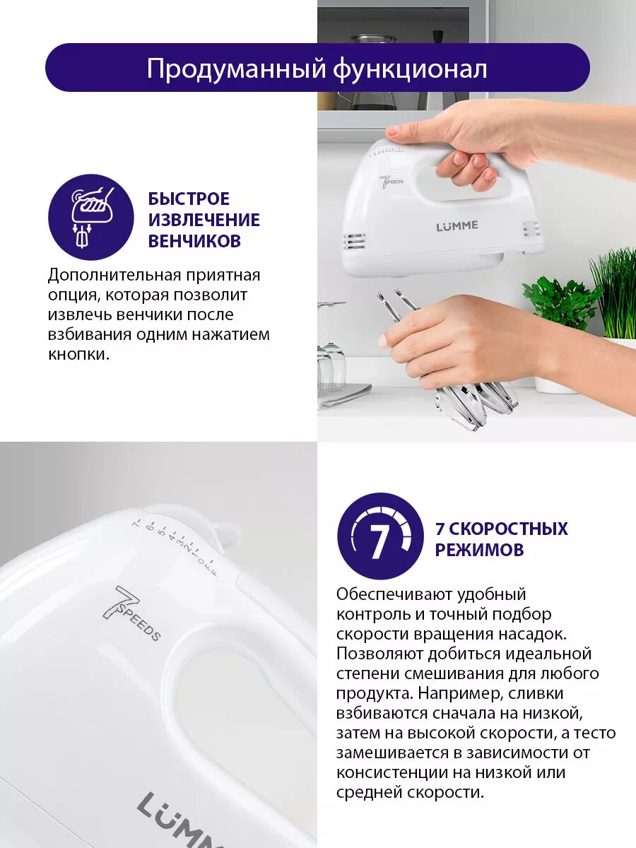 Миксер ручной LUMME LU-MX1874A, мощность 300Вт, 7 скоростей, кнопки извлечения насадок