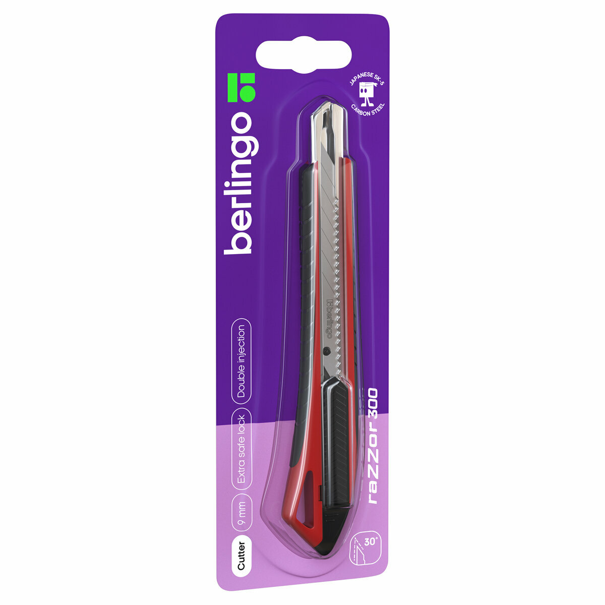 Купить Нож канцелярский Berlingo 9мм "Razzor 300", auto-lock, металл. направл., мягкие вставки, красный, европодвес