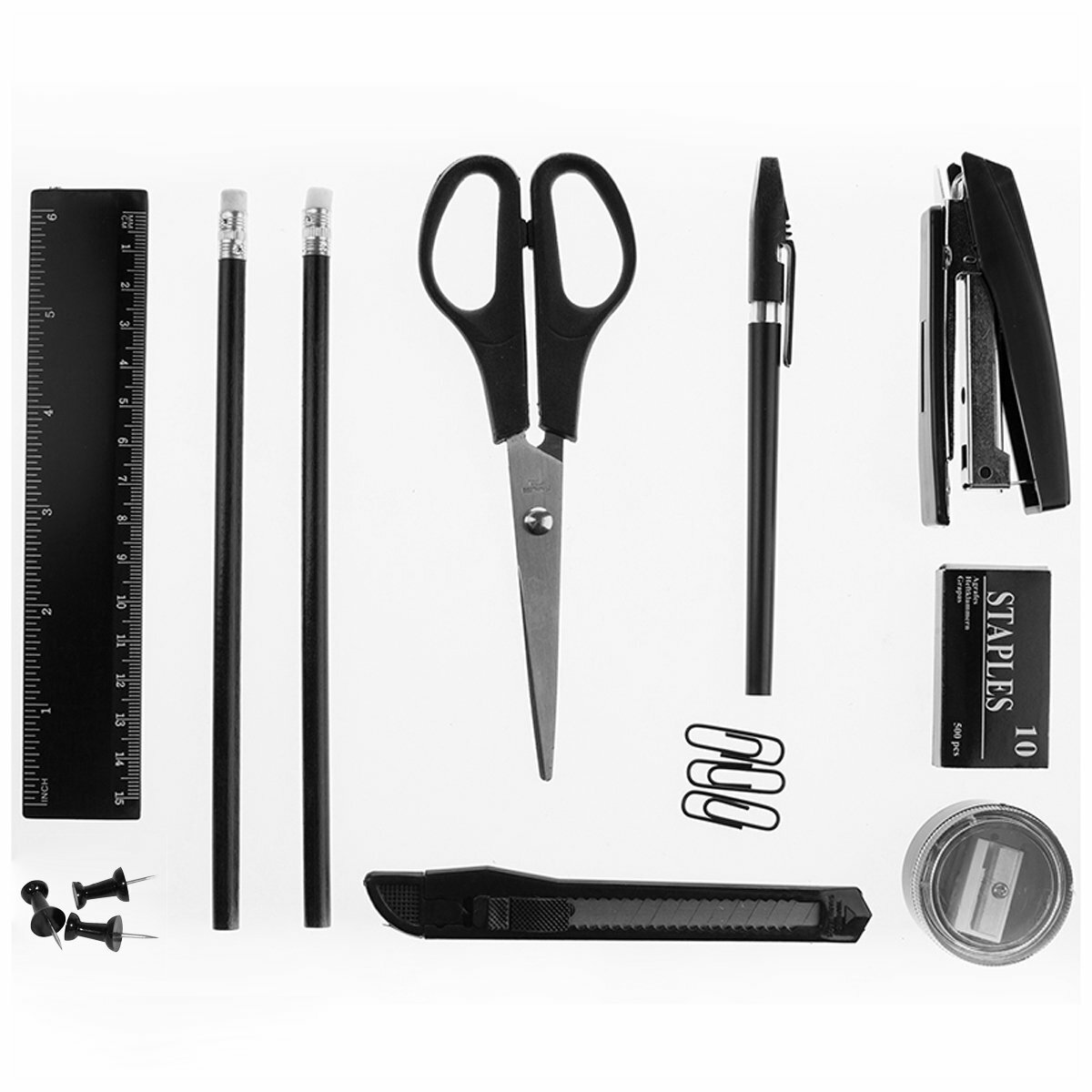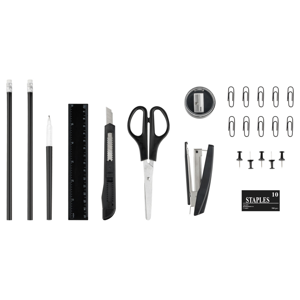| В комплекте | в набор входит 11 предметов: ручка шариковая, два карандаша, точилка для карандашей, степлер для скоб №10, скобы №10, линейка, ножницы, скрепки канцелярские 10 шт., кнопки силовые 5 шт., нож канцелярский. |