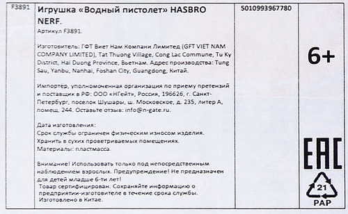 Бластер водный Nerf Суперсокер Гидро Френзи, F3891 интересное: