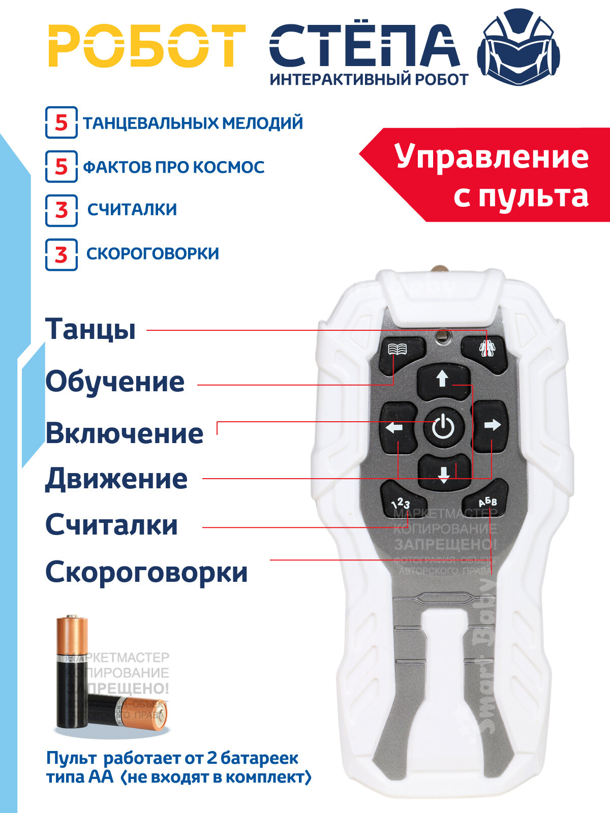 | Дополнительная информация | робот может: изменять направление движения, говорить приветственную фразу, танцевать под музыку (5 мелодий), рассказывать 3 скороговорки, рассказывать 3 считалочки, рассказывать 5 фактов о космосе; тип питания пульта управления: батарейки |