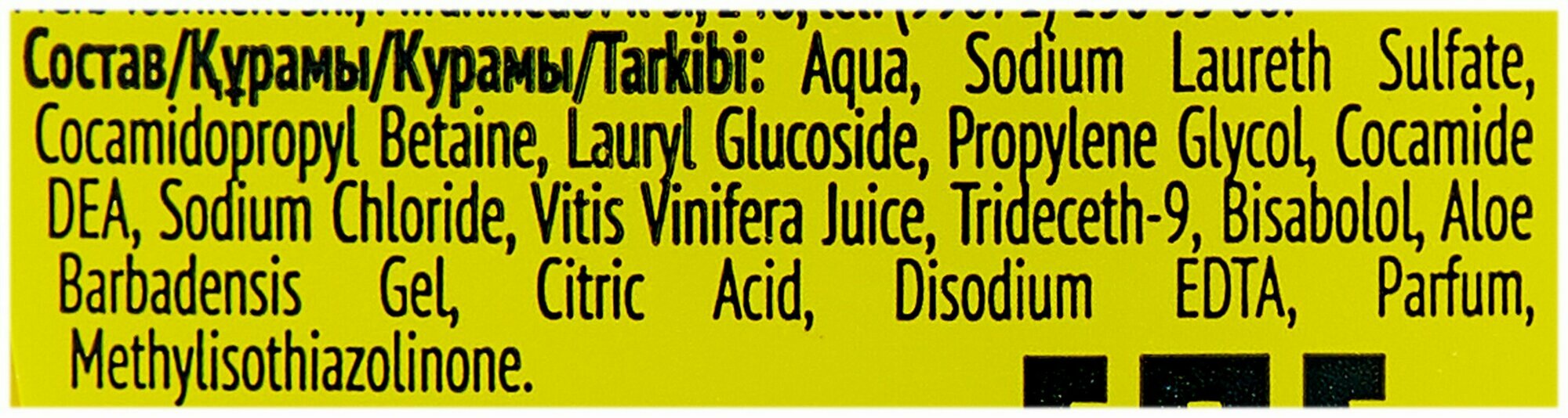 | Состав | aqua, sodium laureth sulfate, cocamidopropyl betaine, lauryl glucoside, propylene glycol, cocamide dea, sodium chloride, vitis vinifera juice, trideceth-9, bisabolol, aloe barbadensis gel, citric acid, disodium edta, parfum, methylisothiazolinone |