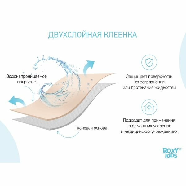| Дополнительная информация | Подкладная клеенка с резинками-держателями защищает матрасы и любую другую поверхность от загрязнения или протекания жидкостей. Удобно крепится к детским матрасам с помощью резинок-держателей. Изделия ROXY-KIDS производятся из специальной медицинской клеенки с ПВХ-покрытием. Все клеенки имеют окантовку по периметру. Они обладают отличной теплопроводностью. Специальный покрывающий слой на основе поливинилхлорида делает поверхность пеленок удобной и комфортной - она быстро приобретает температуру человеческого тела. Отсутствует эффект холодного прикосновения, что очень важно в педиатрии. Микропористая структура данного покрытия придает клеенке свойства газопроницаемости. |