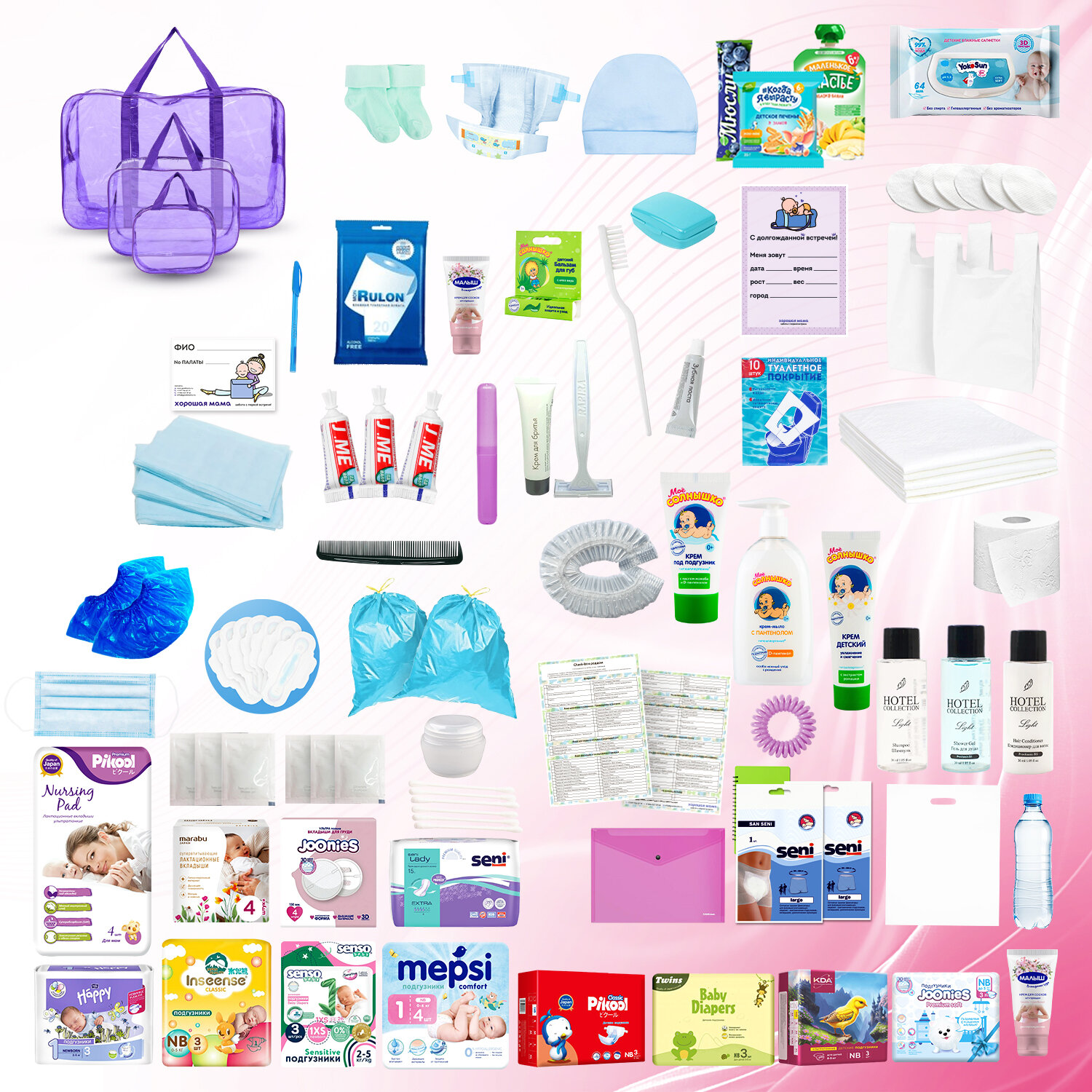 | Состав набора | бахилы, ватные диски, ватные палочки, влажная туалетная бумага, влажные салфетки, крем для сосков, мочалка, мыло, носочки для новорожденного, одноразовые маски, одноразовые покрытия на сиденье унитаза, пеленки для мамы, пеленки для новорожденного, подгузники, прокладки для груди, прокладки послеродовые, трусики, шапочка для душа, шапочка для новорожденного |
