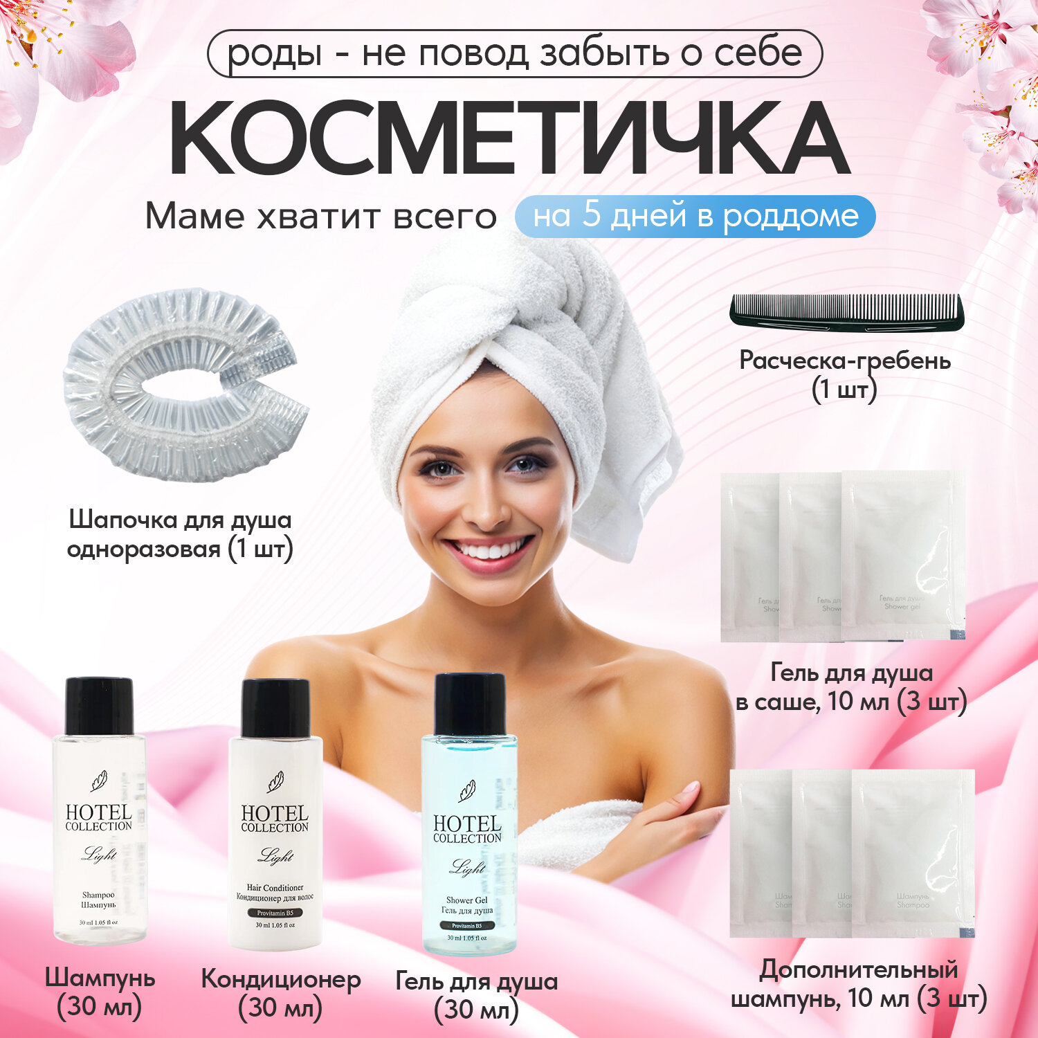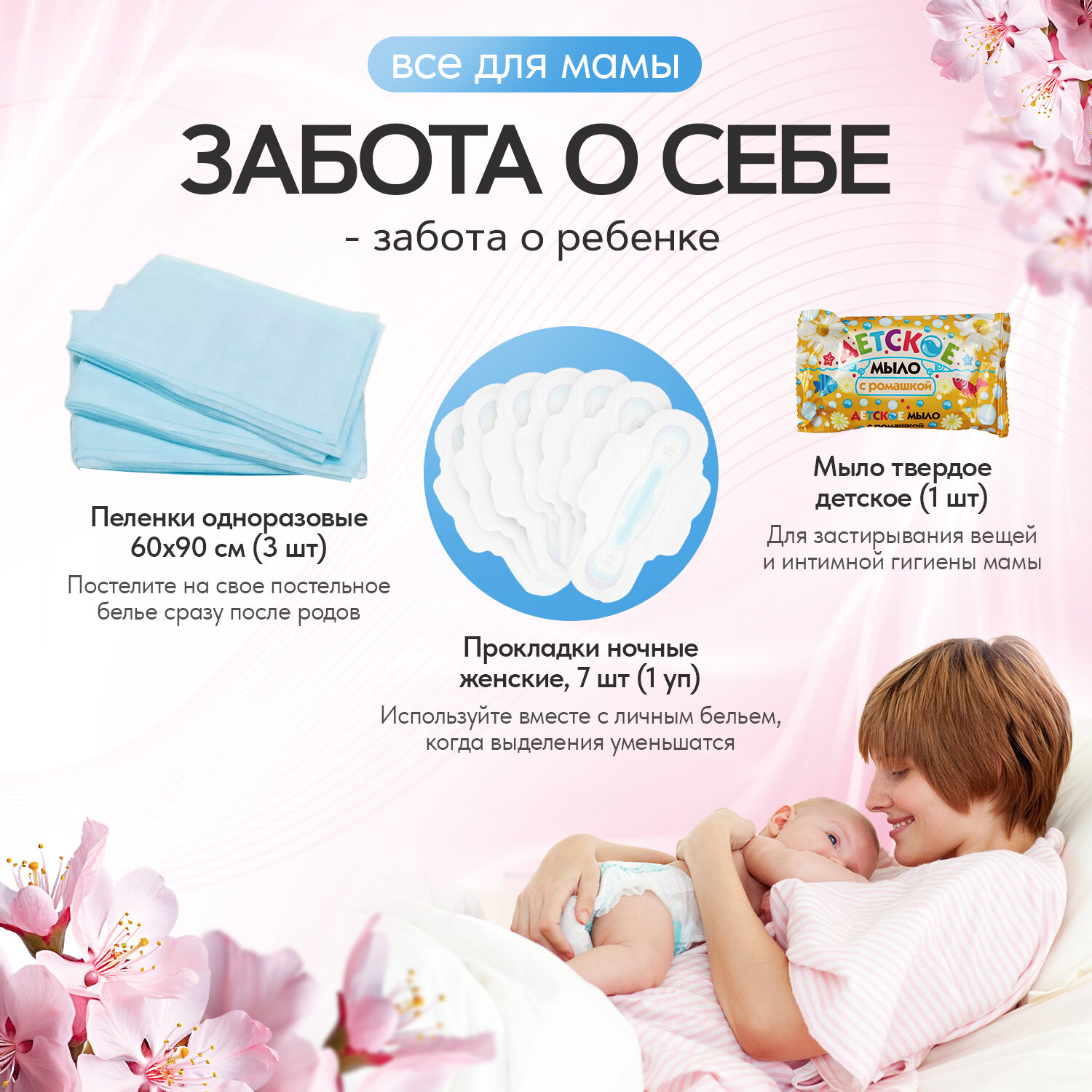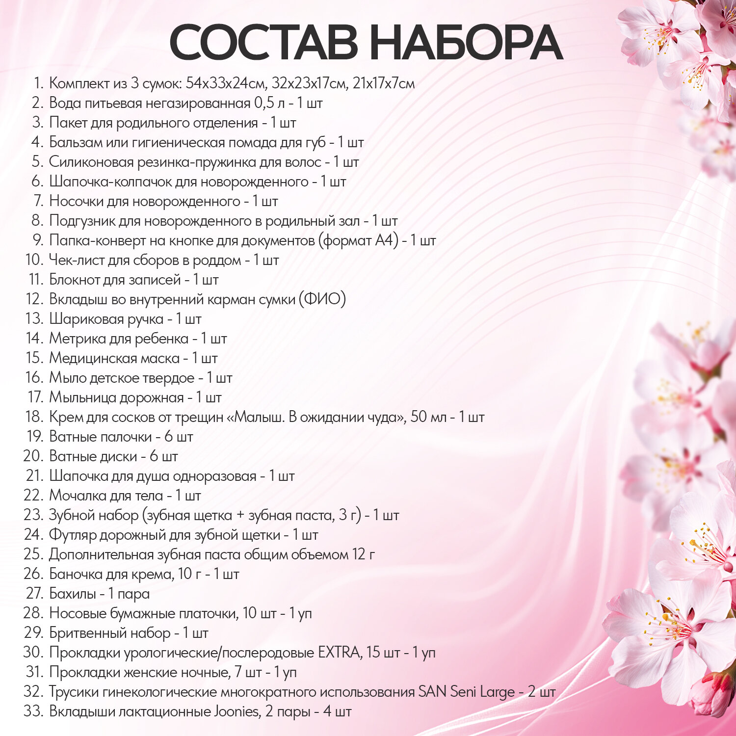 | Состав набора | бахилы, ватные диски, ватные палочки, влажная туалетная бумага, влажные салфетки, крем для сосков, мочалка, мыло, носочки для новорожденного, одноразовые маски, одноразовые покрытия на сиденье унитаза, пеленки для мамы, пеленки для новорожденного, подгузники, прокладки для груди, прокладки послеродовые, трусики, шапочка для душа, шапочка для новорожденного |