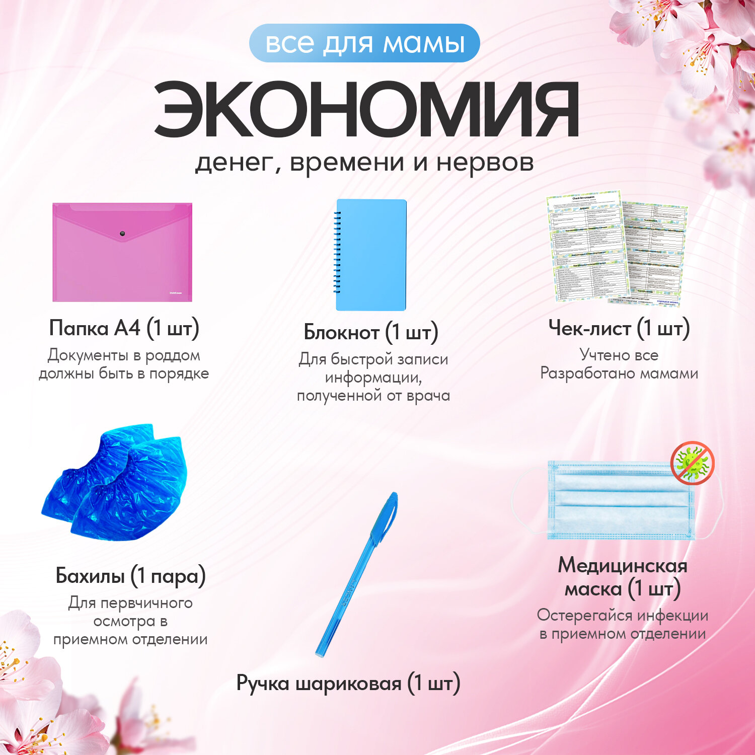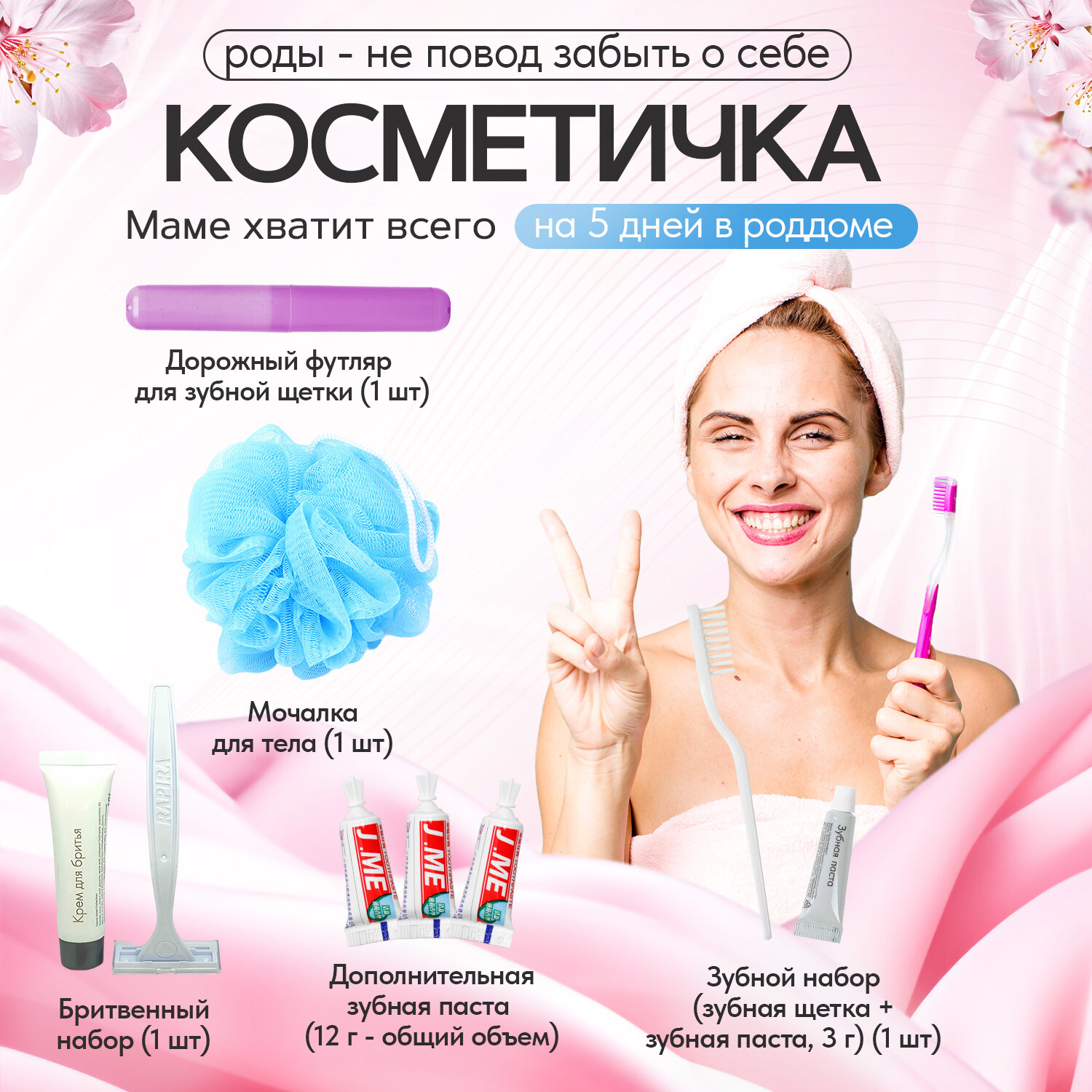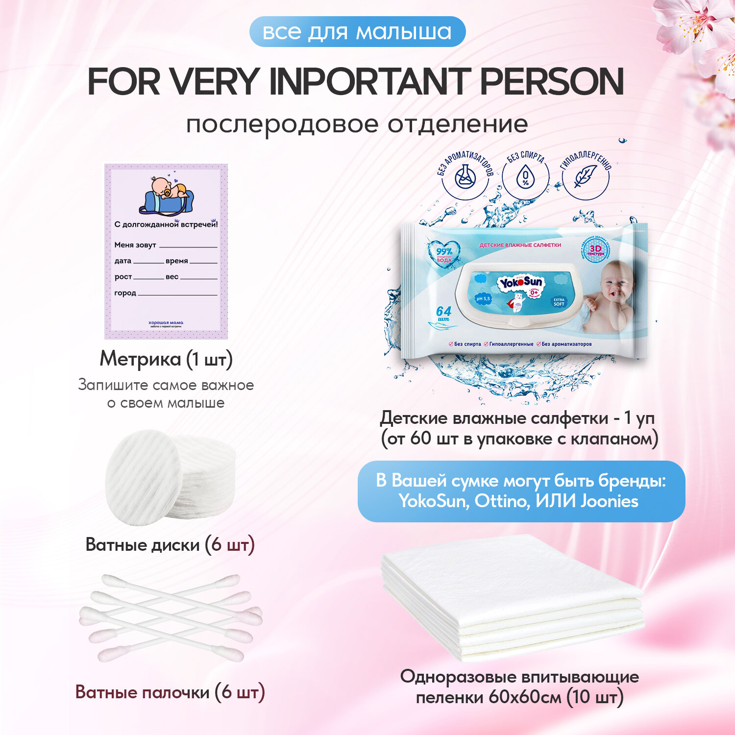 | Состав набора | бахилы, ватные диски, ватные палочки, влажная туалетная бумага, влажные салфетки, крем для сосков, мочалка, мыло, носочки для новорожденного, одноразовые маски, одноразовые покрытия на сиденье унитаза, пеленки для мамы, пеленки для новорожденного, подгузники, прокладки для груди, прокладки послеродовые, трусики, шапочка для душа, шапочка для новорожденного |