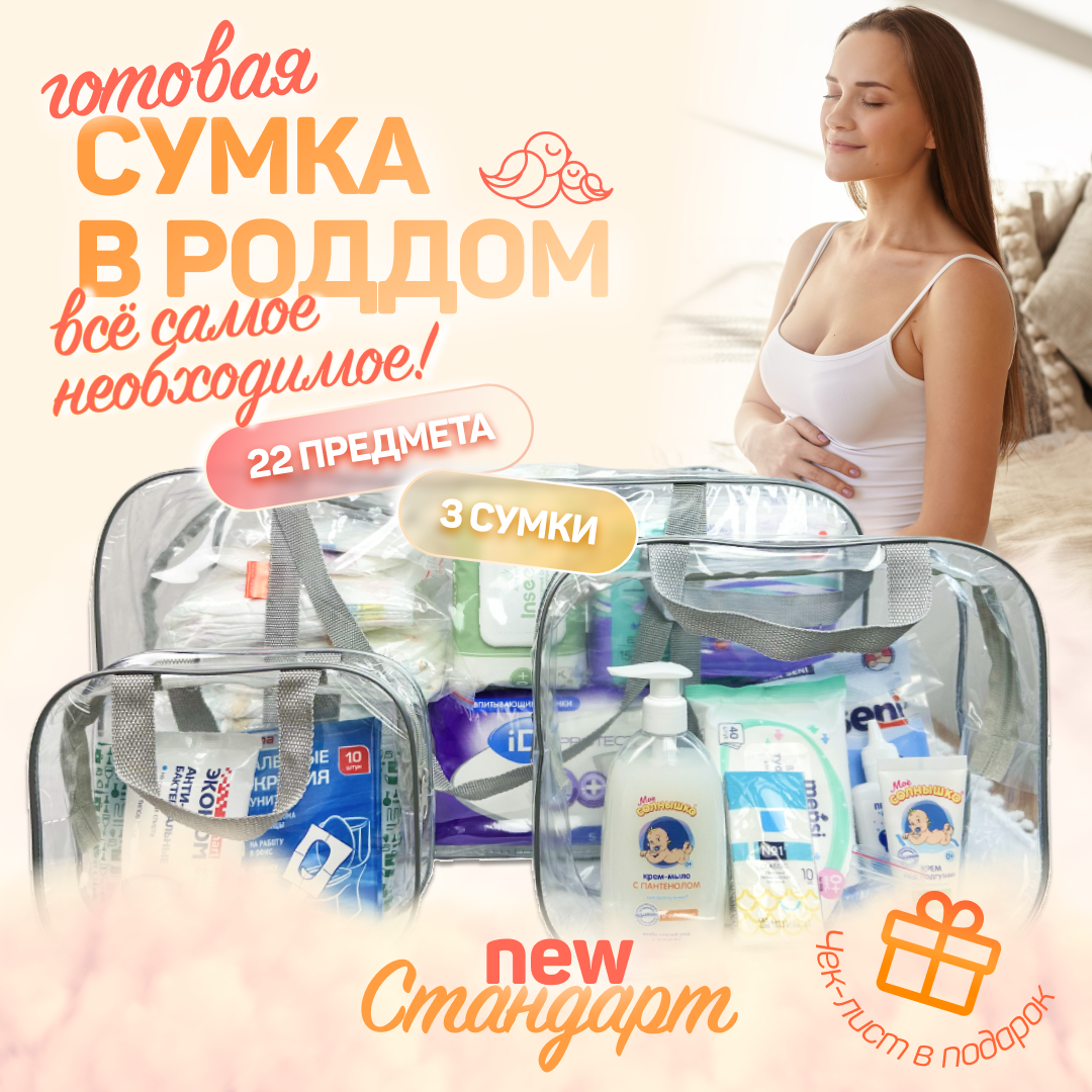 СохранитьСумка в роддом готовая для мамы и малыша с наполнением, 22 предмета, 3 сумки "Стандарт", прозрачная интересное: