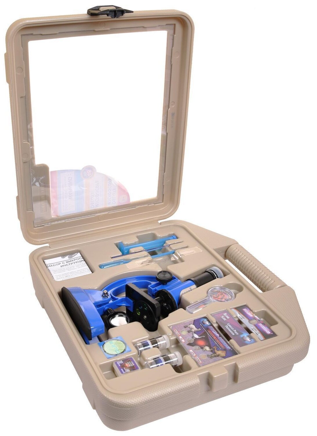 Микроскопом с увеличением 100x600x1200х , с аксессуарами в чемоданчике, 48 предметов, синий,