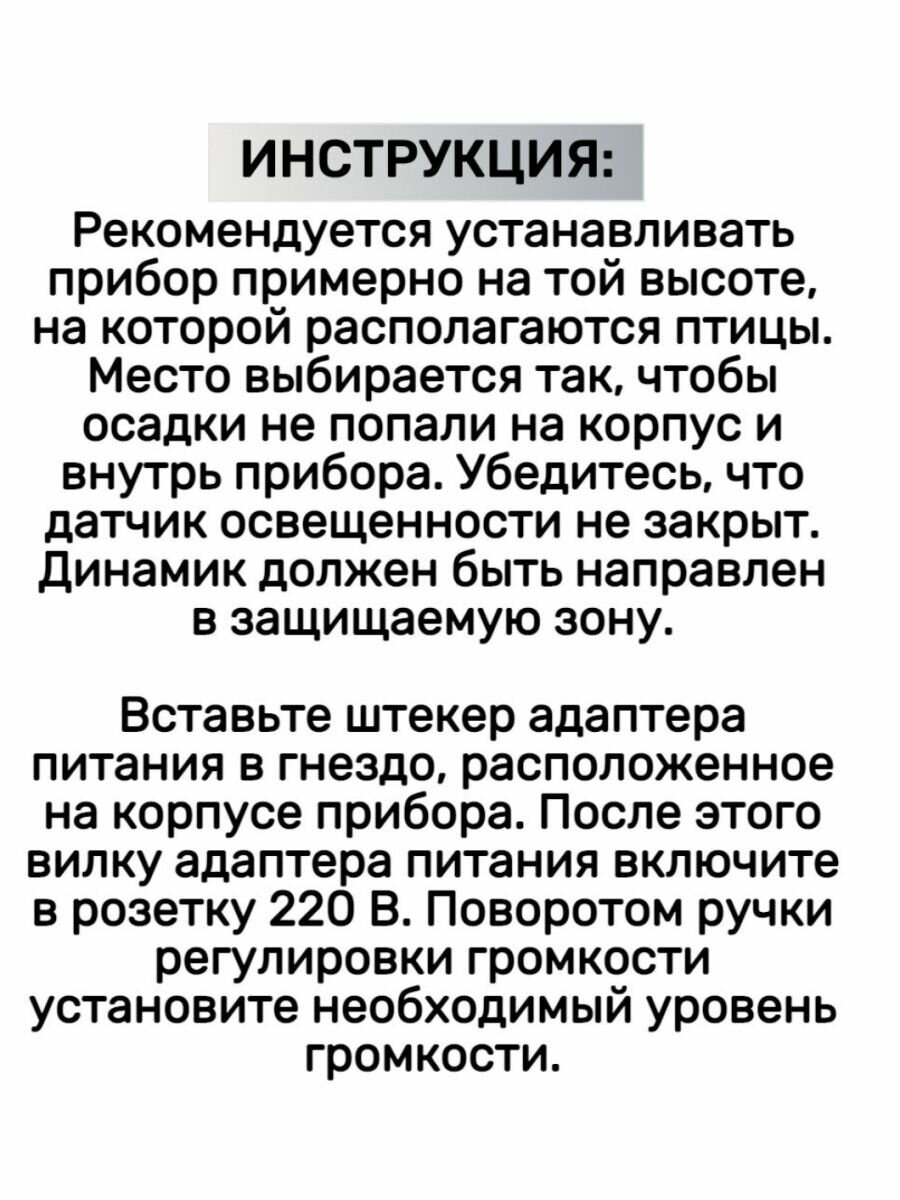Ниже Вы можете прочитать отзывы на Биоакустический отпугиватель птиц «Сокол», ознакомится с подробными характеристиками, посмотреть интересные обзоры и фотографии на Биоакустический отпугиватель птиц «Сокол».