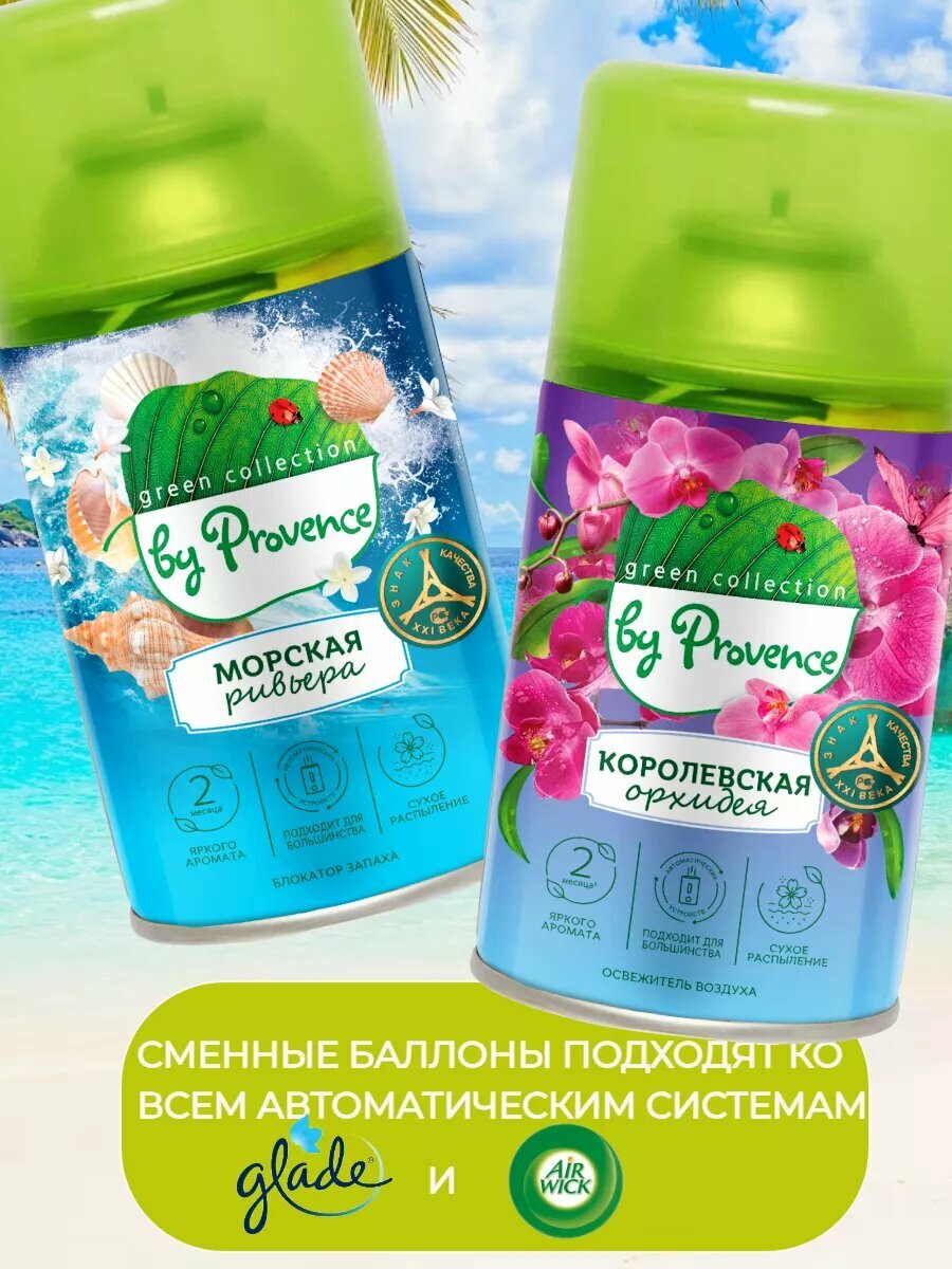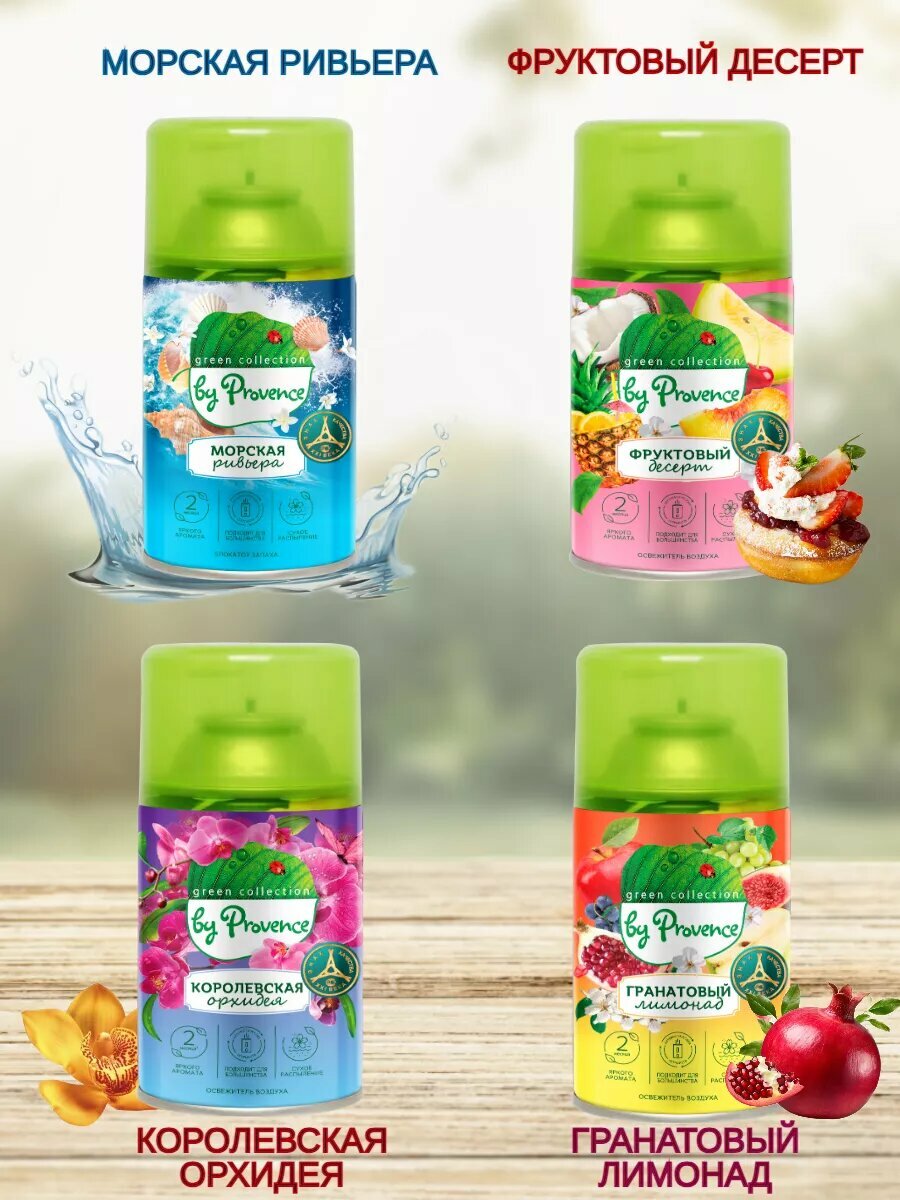Набор 4 штуки освежитель воздуха автоматический Green collection by Provence сменный блок (4 баллона) фруктовый десерт, морская ривьера, королевская орхидея, гранатовый лимонад