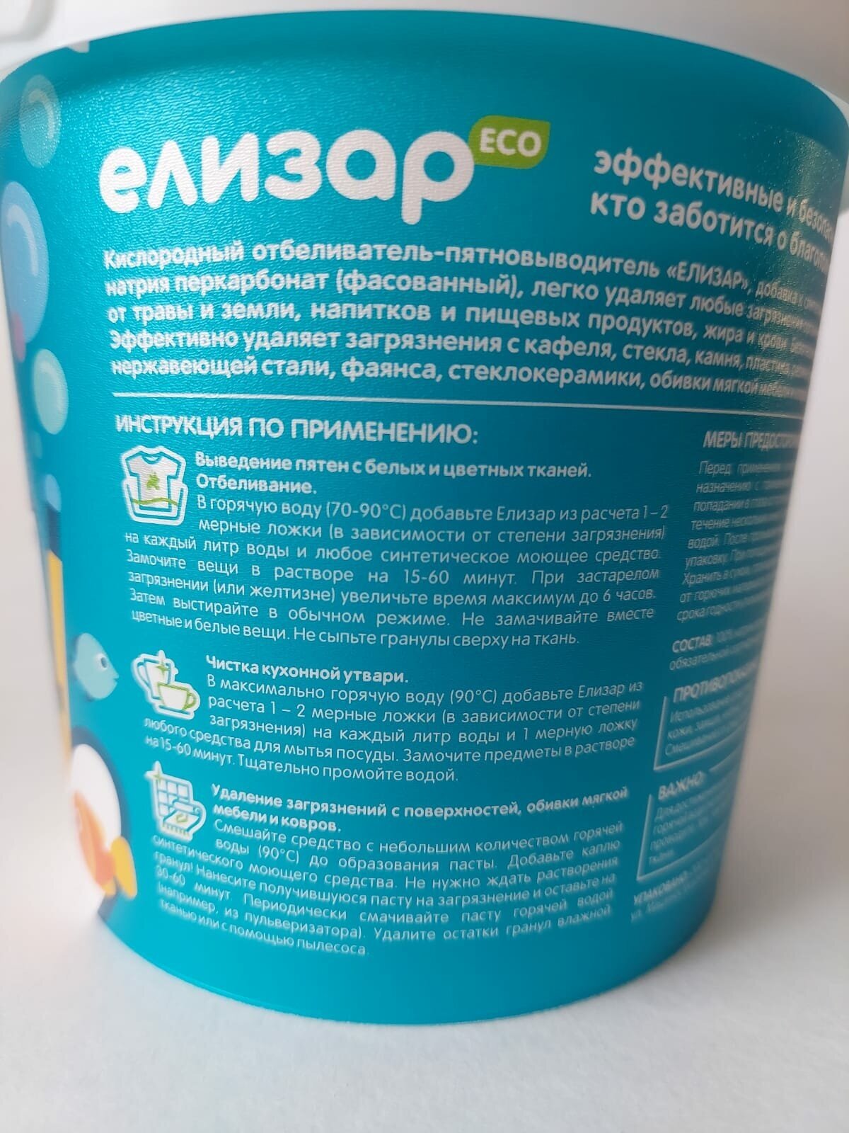 Ниже Вы можете прочитать отзывы на Елизар, кислородный пятновыводитель, отбеливатель, очиститель, концентрат 1 кг, для цветного и белого, ознакомится с подробными характеристиками, посмотреть интересные обзоры и фотографии на Елизар, кислородный пятновыводитель, отбеливатель, очиститель, концентрат 1 кг, для цветного и белого.