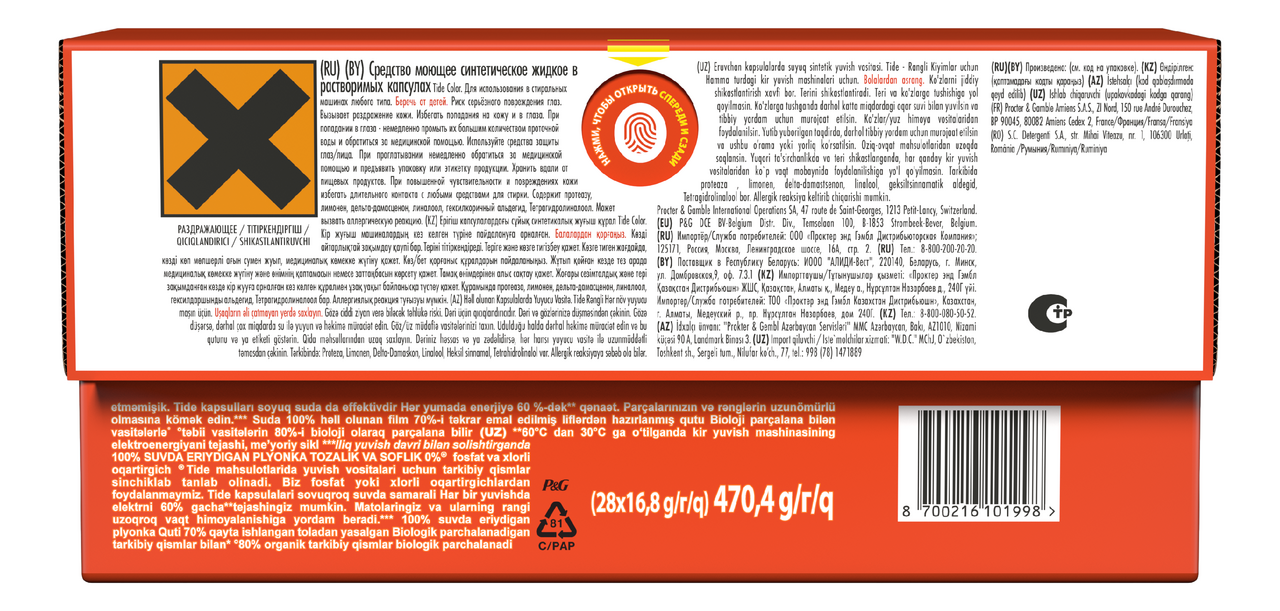 | Дополнительная информация | Как добиться потрясающе эффективной стирки и яркости цвета с минимальными усилиями? На помощь придут капсулы для стирки цветного белья Tide Всё в 1 Color. Капсулы Tide PODs - это инновационное средство для очищения одежды и белья. При контакте с водой пленка капсулы растворяется и ингредиенты смешиваются, начиная действовать. Точная дозировка позволяет отстирать целый барабан вещей всего одной капсулой. Специальная формула быстро действует, удаляя загрязнения, очищает даже стойкие и сложные пятна и сохраняет яркость цвета стирка за стиркой. ПРЕИМУЩЕСТВА TIDE PODS ВСЁ В 1 COLOR: - Выводят пятна, очищают и освежают бельё - Обеспечивает идеальное отстирывание и кристальную чистоту - Яркость цвета без выцветания - Превосходная чистота с первой стирки даже при 20°C - Простота использования: не нужно отмерять и наливать Наши стиральные средства не содержат фосфаты или хлор. Все активные компоненты биоразлагаемы. Храните упаковки капсул в месте, недоступном для детей. |