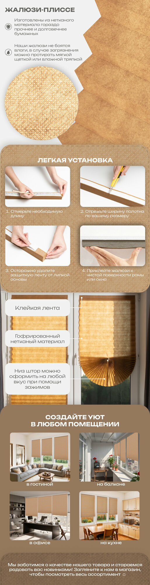 Жалюзи плиссе тканевые на липкой ленте, 90*180см, бежевые,I Шторы плиссе текстильные на липучке I Штора от солнца I Жалюзи самоклеящиеся вертикальные I