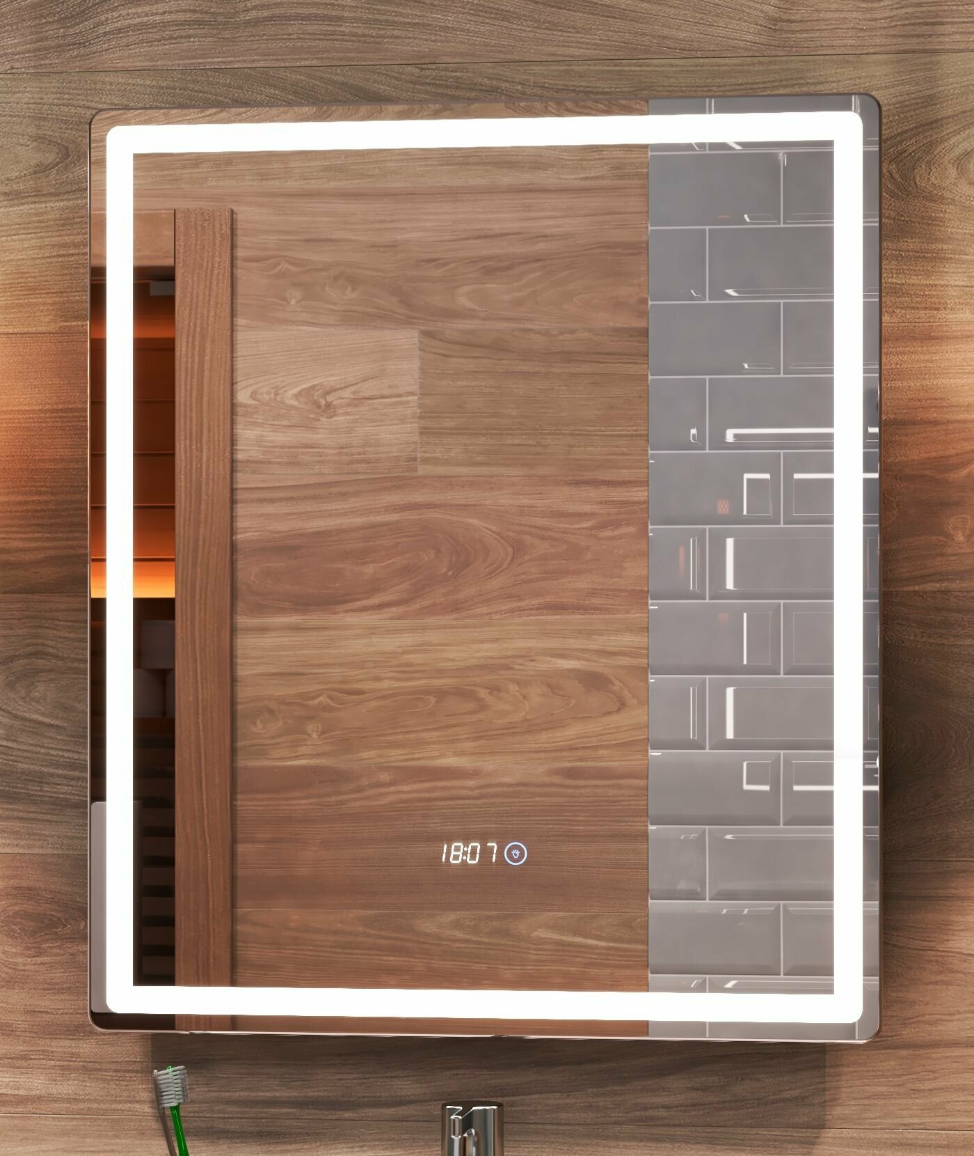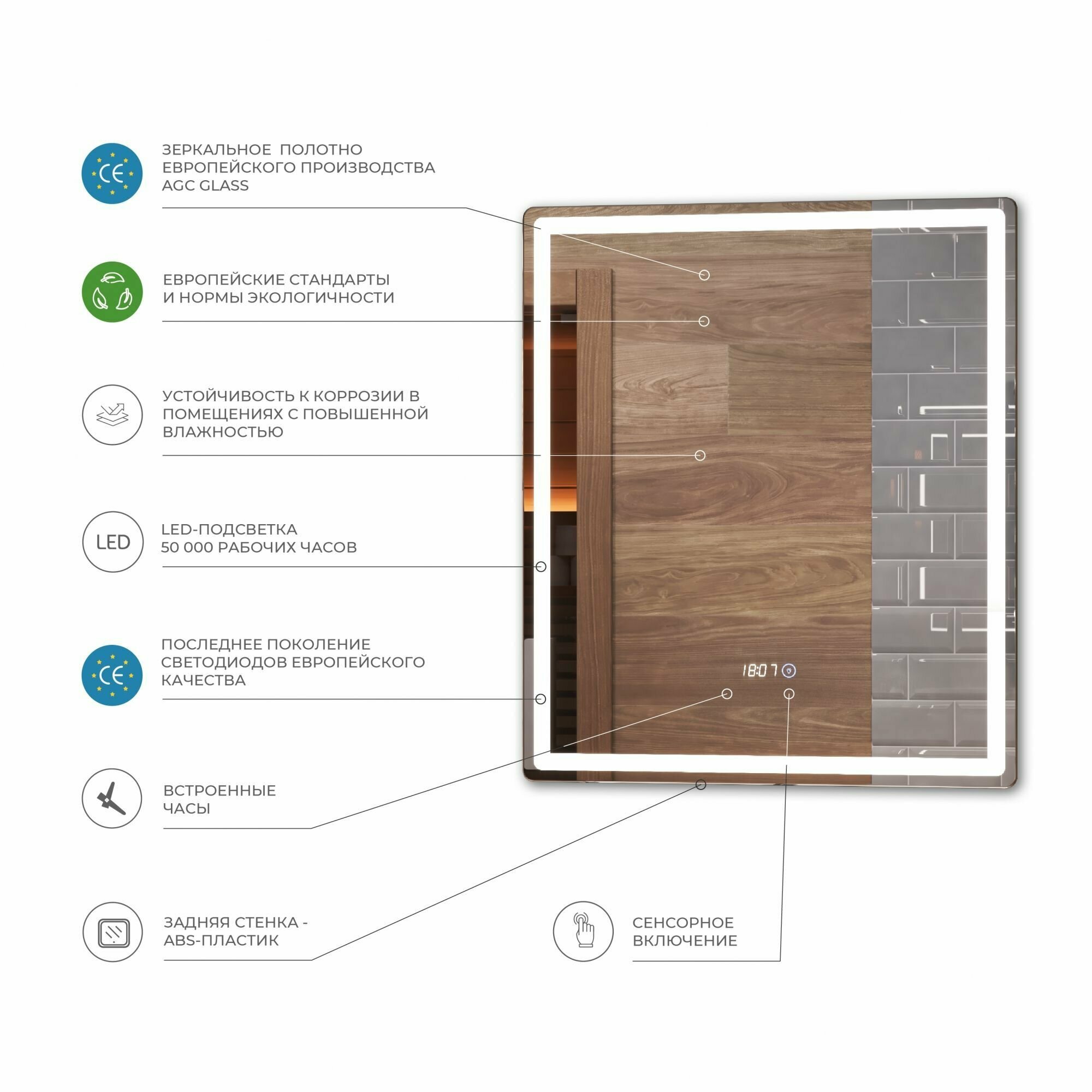| Особенности | без рамы, подсветка, полочка, с часами, сенсорный выключатель подсветки |