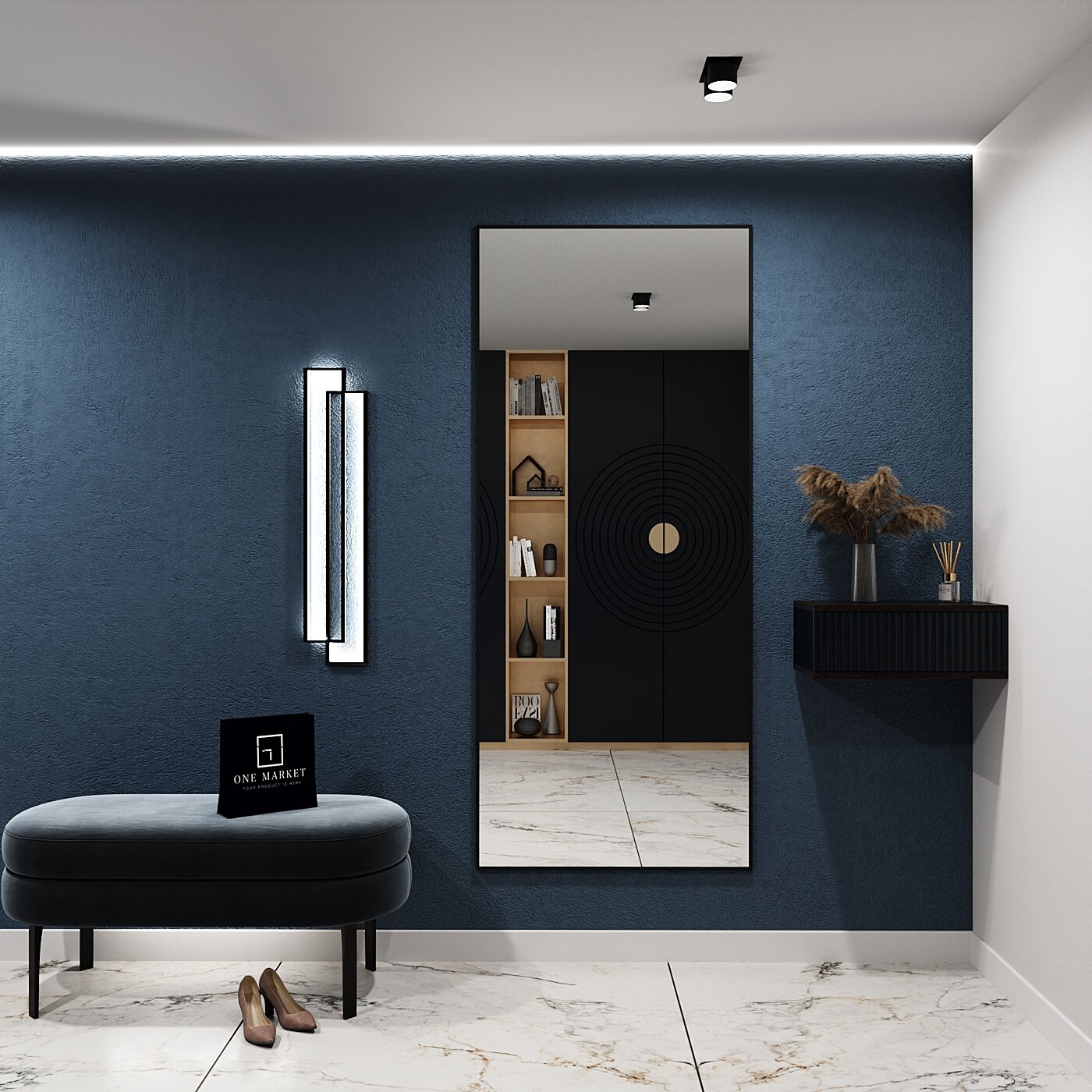 Зеркало настенное в алюминиевой раме ONE MARKET , 161х50 см. Черное