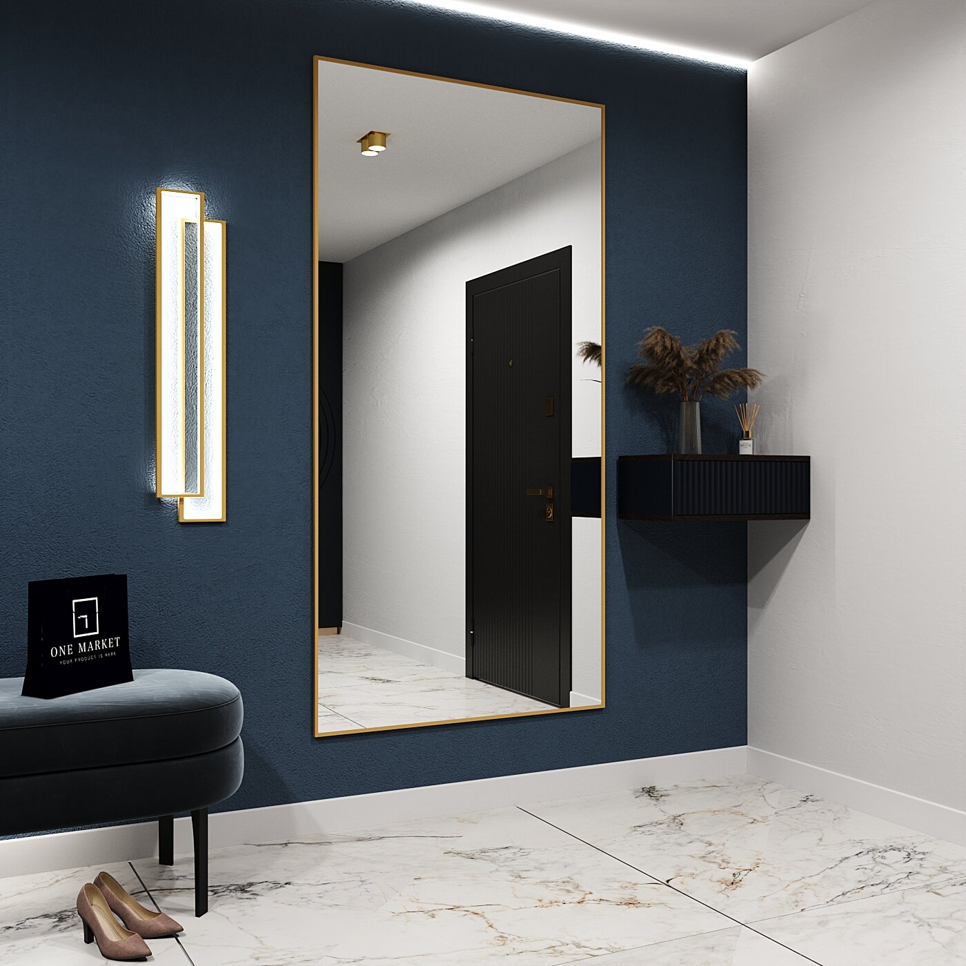 Зеркало настенное в алюминиевой раме ONE MARKET , 200х60 см. Золото
