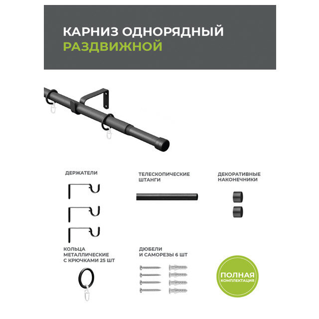 | Комплектация | Направляющая раздвижная - 1 шт, наконечники - 2 шт, держатели - 3 шт, кольца с крючками - 25 шт, шурупы с дюбелями - 6 шт. |