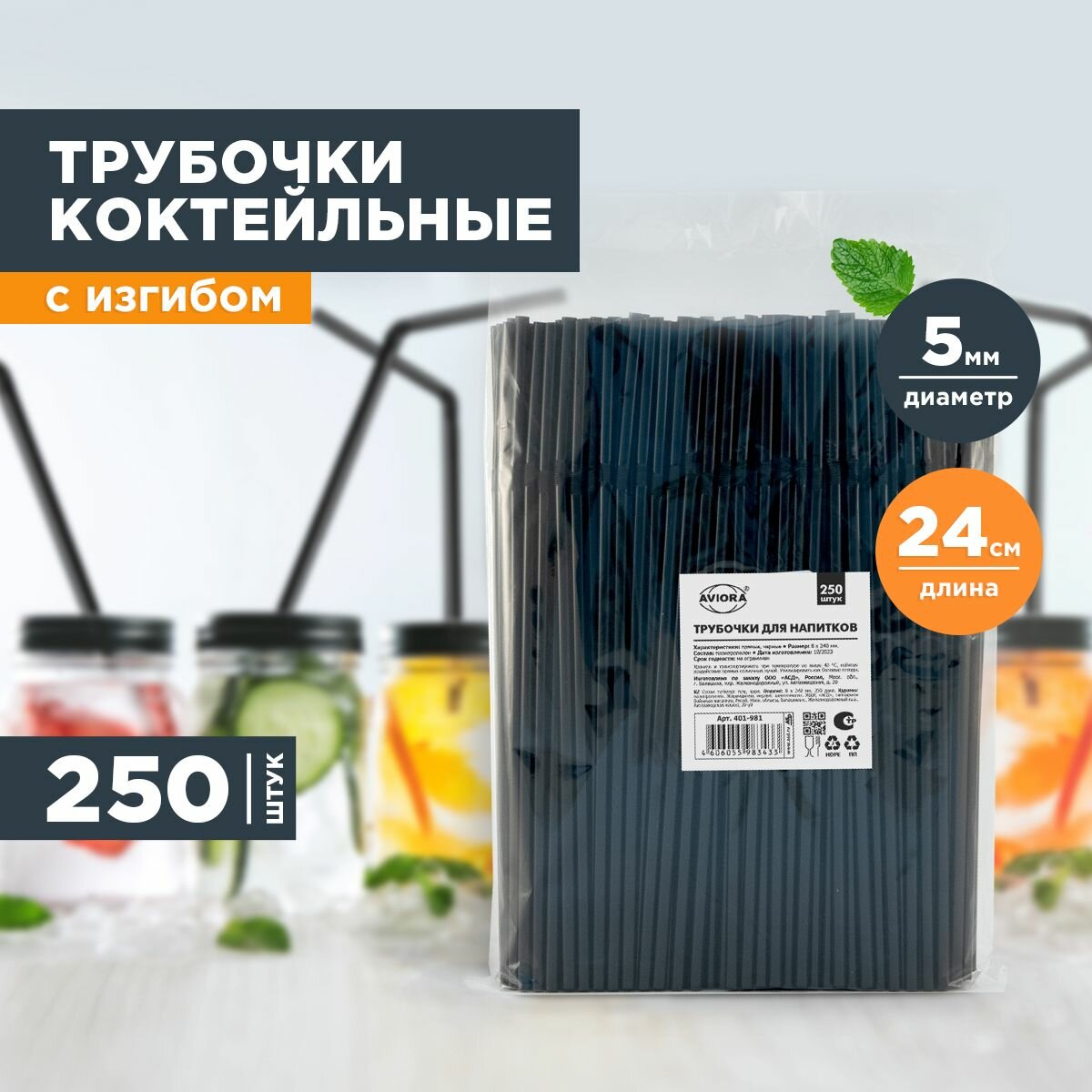Трубочки для коктейлей Aviora Черные с изгибом, диаметр 5 мм, длина 240 мм, 250 шт (401-979) интересное: