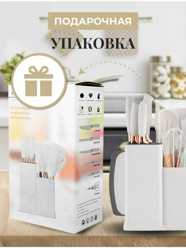 | Комплектация | Щипцы кухонные, лопатка кондитерская и лопаточка с отверстиями для жарки на сковороде, ложка для спагетти, ложка для салата, ложка для выпечки, шпатель, половник, шумовка, венчик для взбивания, кисточка для масла, 5 ножей разного размера, разделочная доска и подставка для хранения приборов. |